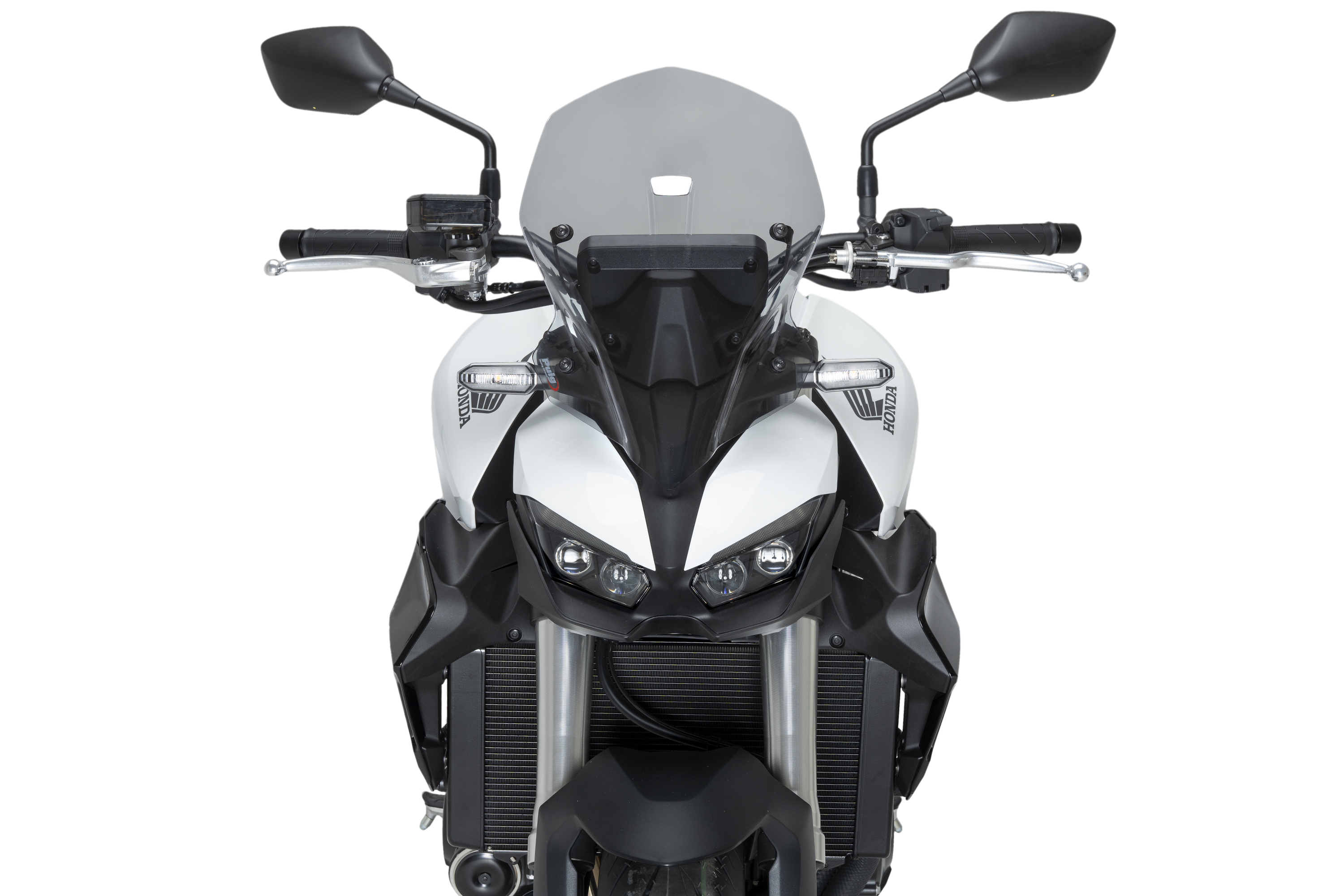 Con unas dimensiones de 270 mm de ancho y 375 mm de alto, la pantalla NG Touring de Puig es 160 mm más alta que el cuentakilómetros de la Honda CB1000 Hornet, lo que permite una mayor desviación del flujo de aire y, en consecuencia, una protección aerodinámica superior para el piloto.
