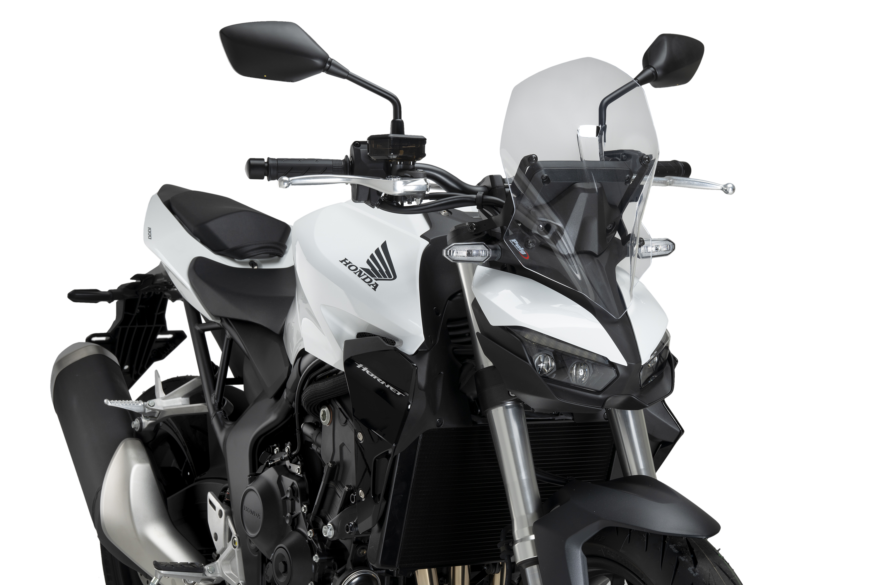 La nueva pantalla NG Touring de Puig para la Honda CB1000 Hornet ha sido diseñada con un claro objetivo: mejorar la protección aerodinámica en la zona del torso del piloto, especialmente en trayectos largos, sin perder de vista la estética y manteniendo la coherencia con las líneas agresivas y modernas de la moto.