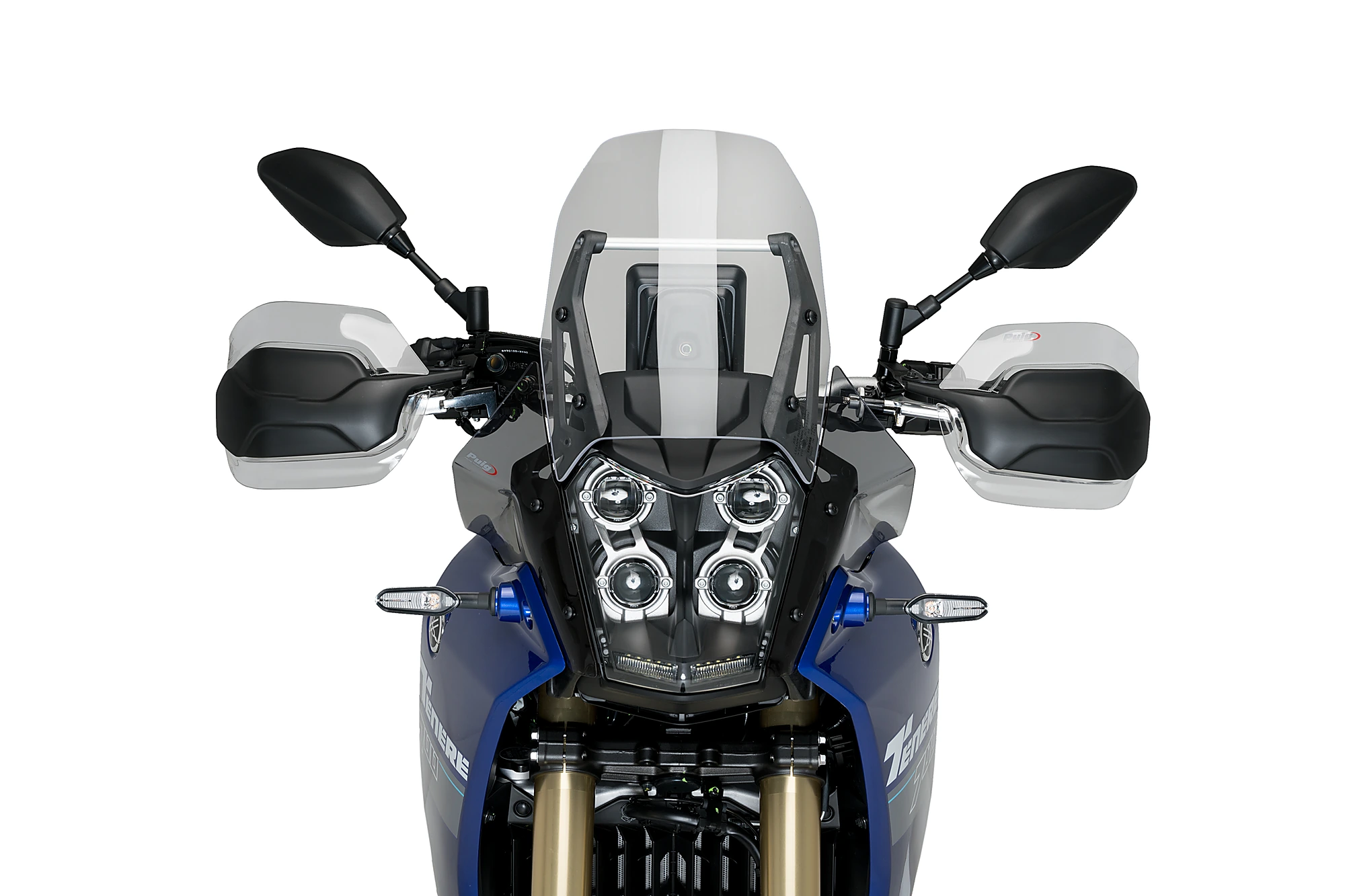 De elegante y compacto diseño, los deflectores de Puig quedan perfectamente integrados en el moderno frontal de la Yamaha Ténéré 700. Además, están disponibles en color transparente, ahumado claro y ahumado oscuro, para poder elegir el que mejor combine con el color de la cúpula.