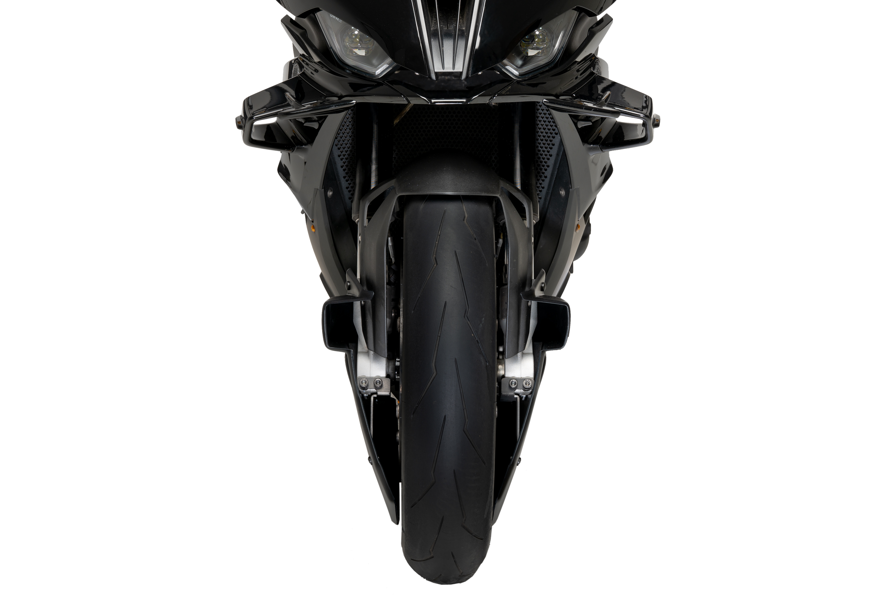 Su estudiado diseño, además de aportar una estética más deportiva y personalizada, elimina turbulencias en la rueda delantera al crear una tapa lenticular parcial que favorece la aerodinámica de la moto, sobre todo a altas velocidades. Incluye soportes de resistente y ligero aluminio acabados en un discreto color negro texturizado.