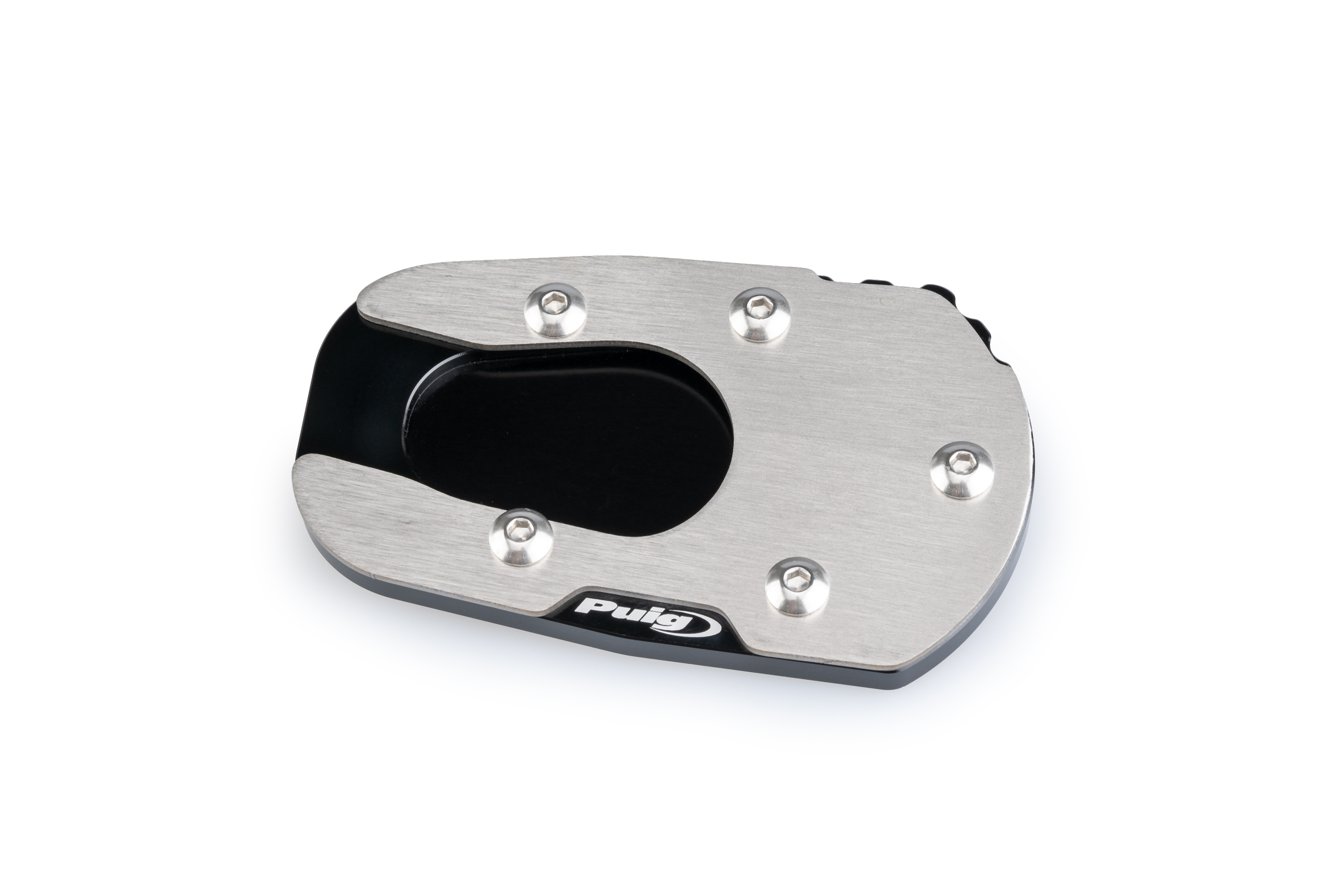 Diseñada para prevenir posibles caídas de la moto mientras se encuentra estacionada. Esta pieza, con una base un 100% más amplia respecto a la original permite estacionar en superficies blandas o irregulares con mayor seguridad. Se trata de una pieza mixta, con una parte en acero inoxidable y otra mecanizada a partir de un bloque de aluminio con anodizado posterior. Estos materiales aportan una gran resistencia manteniendo un peso reducido (110-160g según modelo). Este producto evitará que la motocicleta pueda sufrir cualquier percance cuando no está en uso.