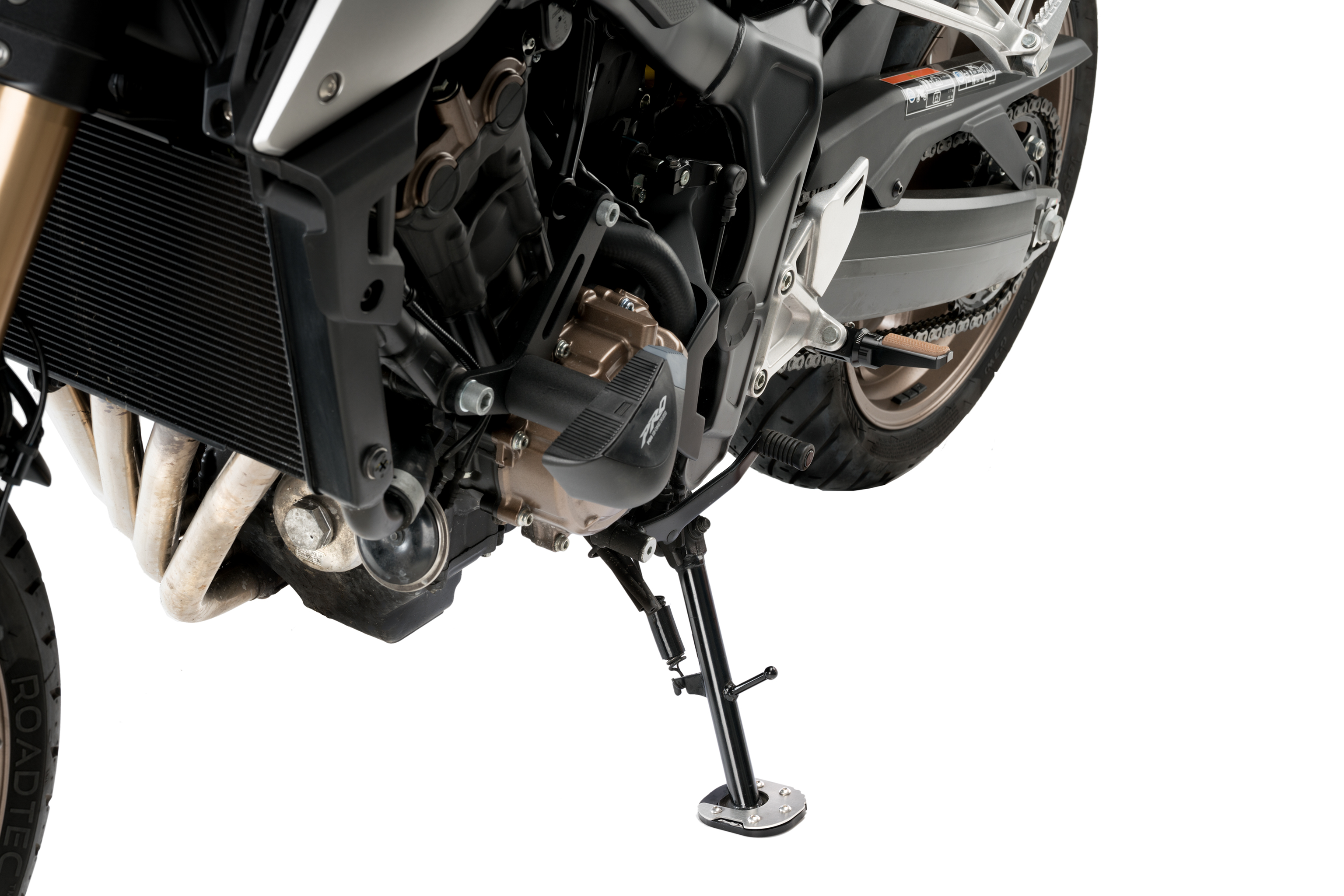 Dota a tu moto de mayor estabilidad y superficie de apoyo mientras esté aparcada con la nueva extensión de pata de cabra de Puig.