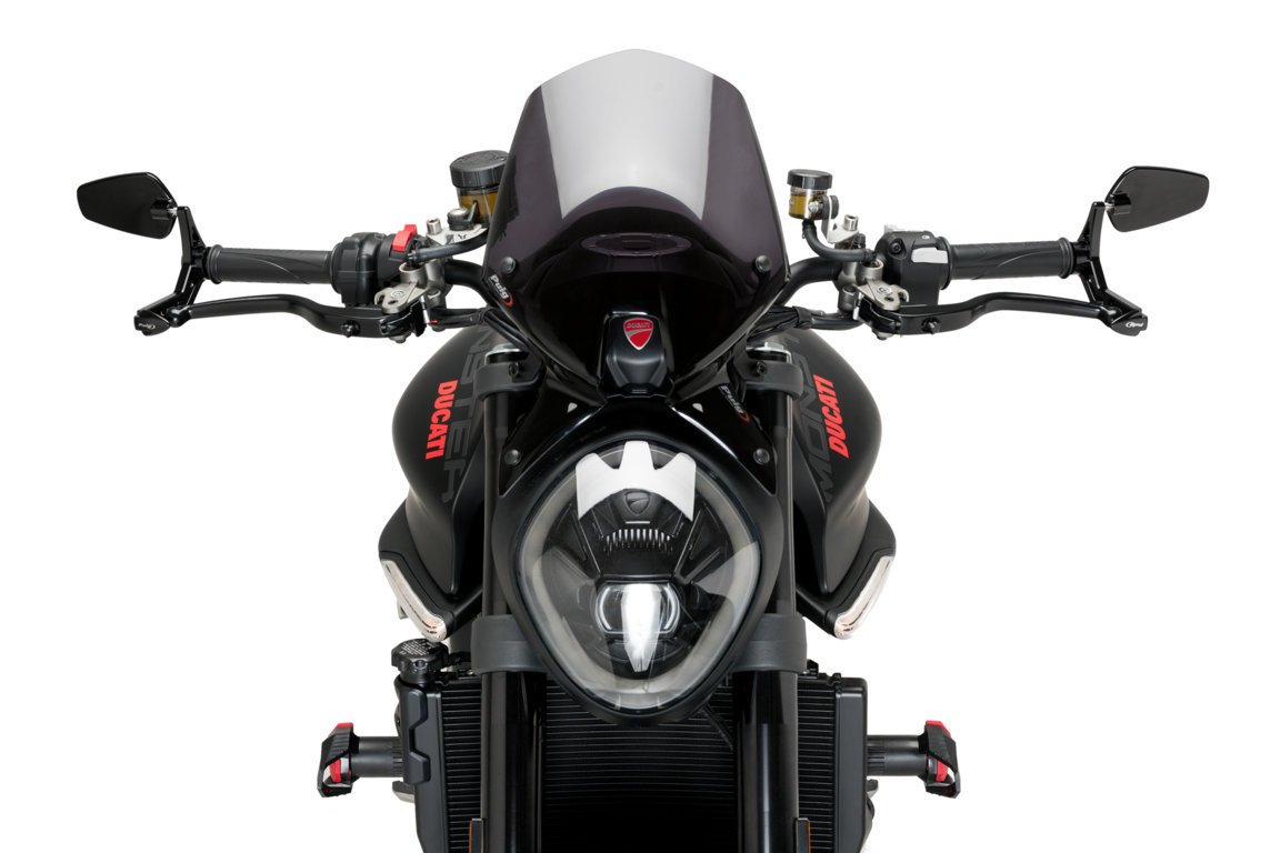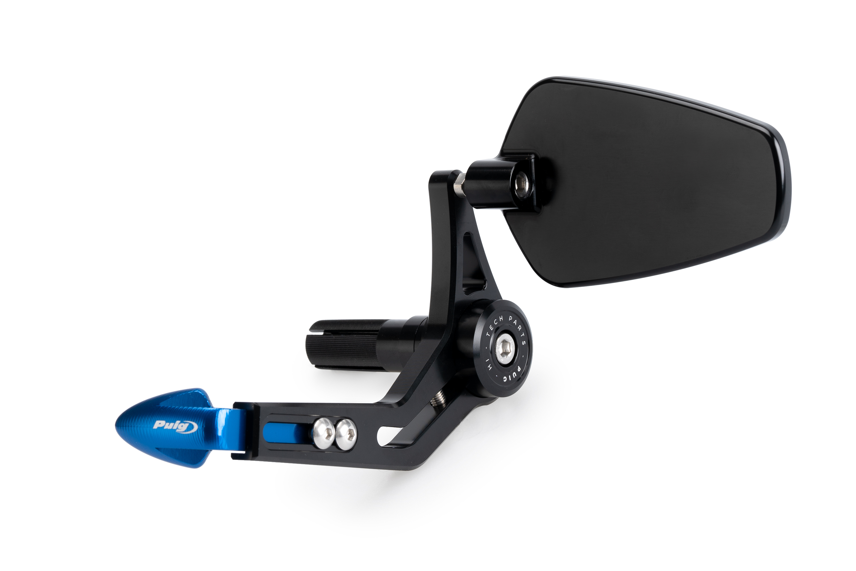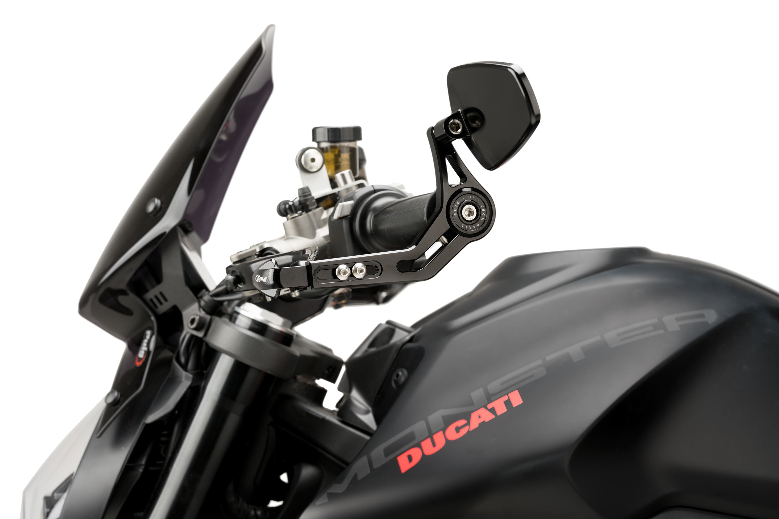 Este artículo de Puig es todo un ejercicio de diseño y practicidad ya que consigue fusionar de forma elegante y compacta el protector de maneta con un retrovisor colocado al final del manillar.