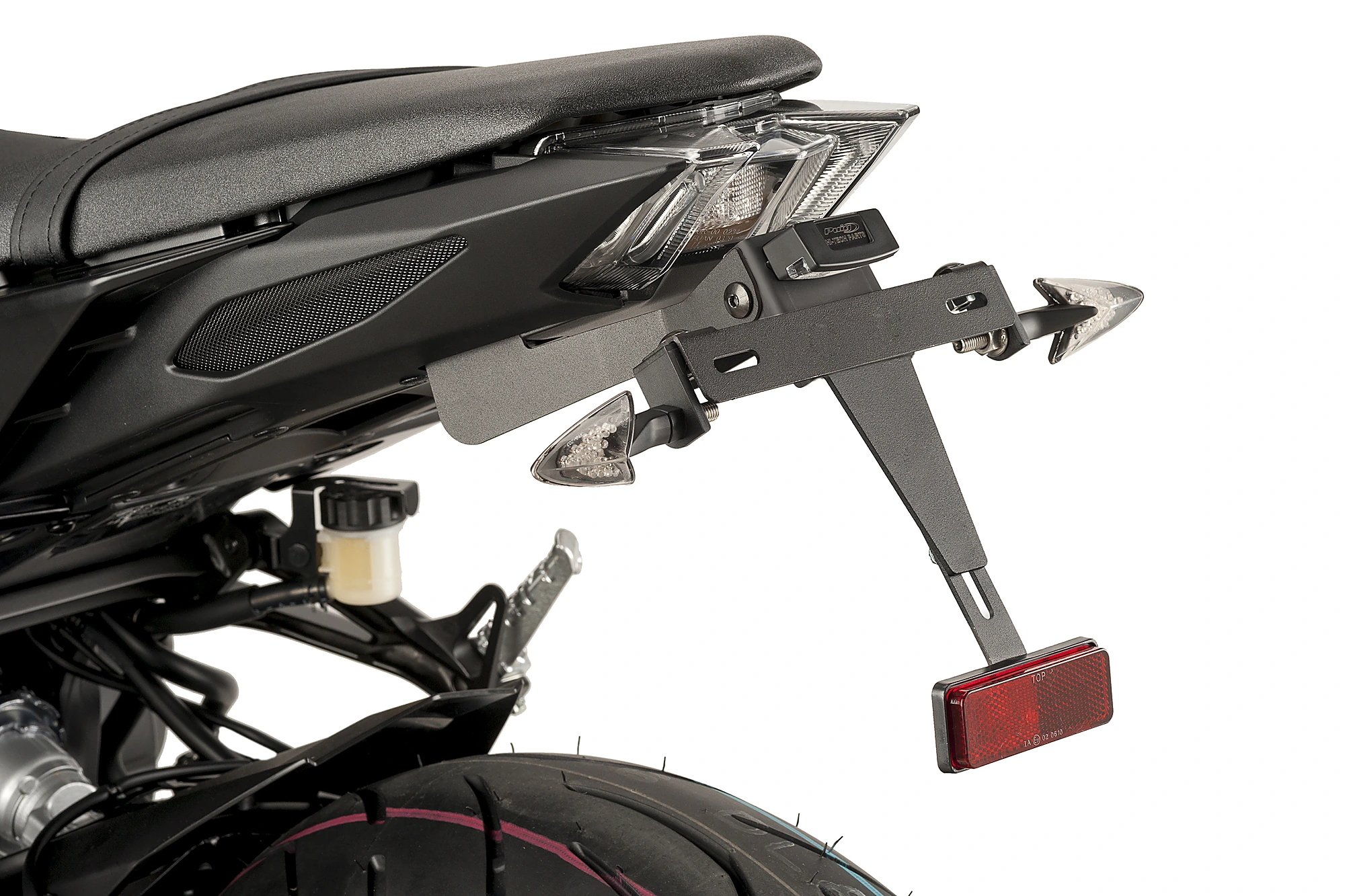 Sustituye el portamatrículas original de tu moto por el soporte portamatrículas de Puig, que, gracias a su ubicación elevada, proporciona un aspecto deportivo a tu motocicleta. El conjunto combina piezas de acero con acabado en pintura epoxi y elementos de poliamida, logrando una notable reducción de peso en comparación con el soporte original.