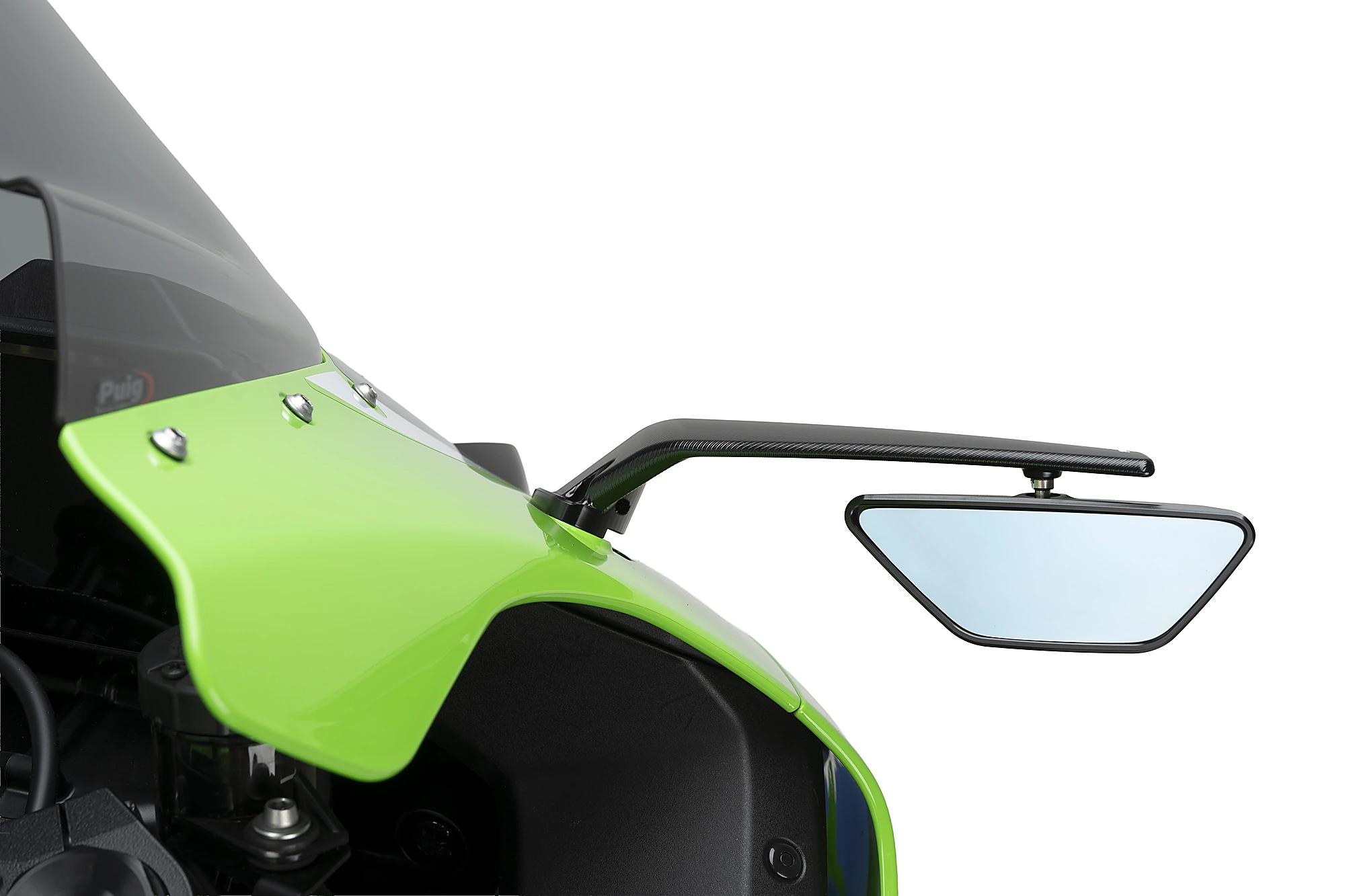 El alerón-retrovisor ha sido desarrollado con la tecnología del túnel del viento virtual gracias a la amplia experiencia de Puig en la máxima competición como el Mundial de MotoGP y SBK, inspirándose en los últimos avances en el campo de la aerodinámica. Está mecanizado a partir de un bloque de aluminio y dispone de un elegante anodizado en color negro para conseguir un cuidado acabado.