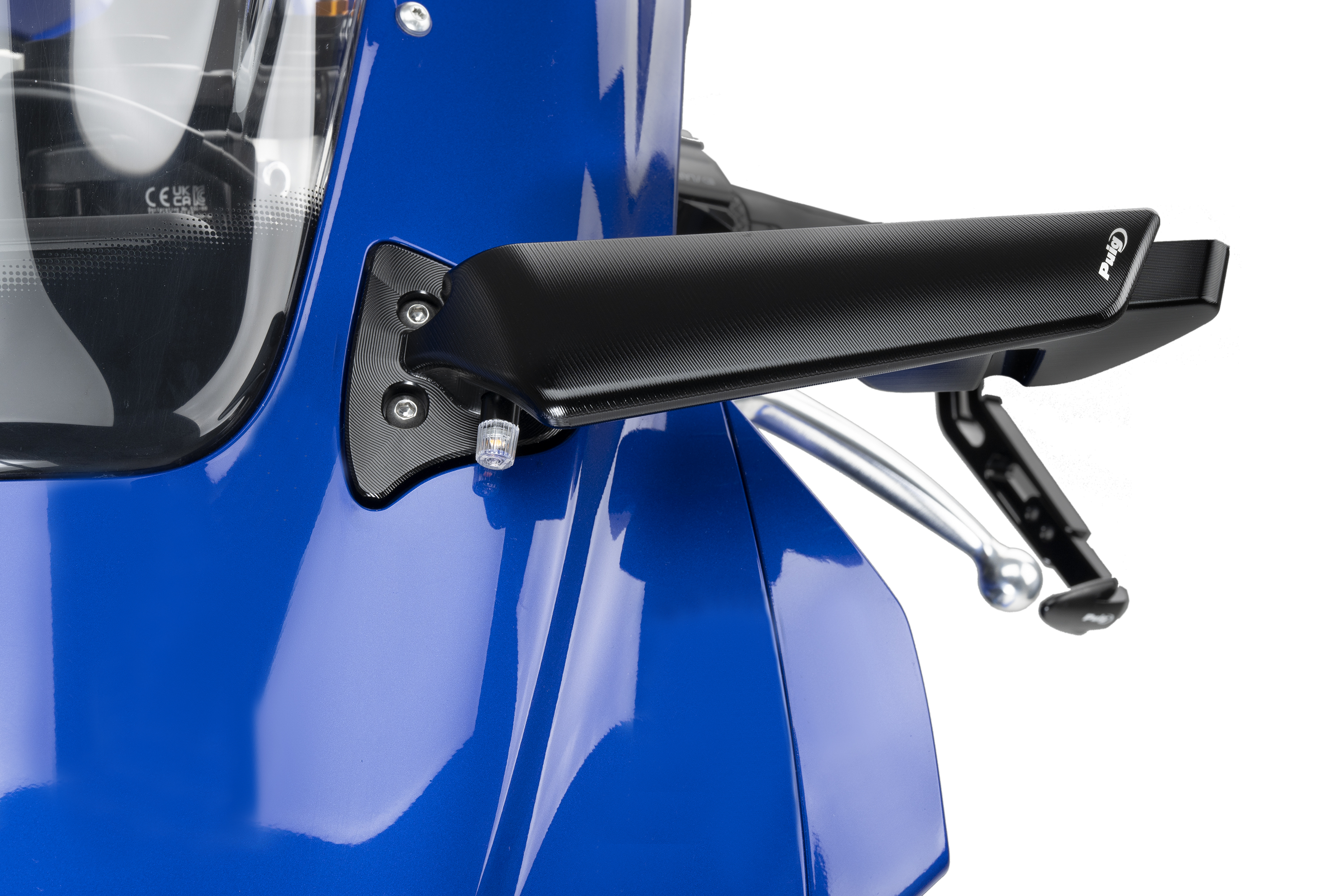 En un completo ejercicio de diseño, Puig ha conseguido aunar en un mismo producto las ventajas aerodinámicas de los alerones Downforce laterales con la eficiencia de sus retrovisores y la opción de instalar los intermitentes TAB. Todo ello en una compacta pieza de atractiva estética, ideal para personalizar la estética de las motos más deportivas.