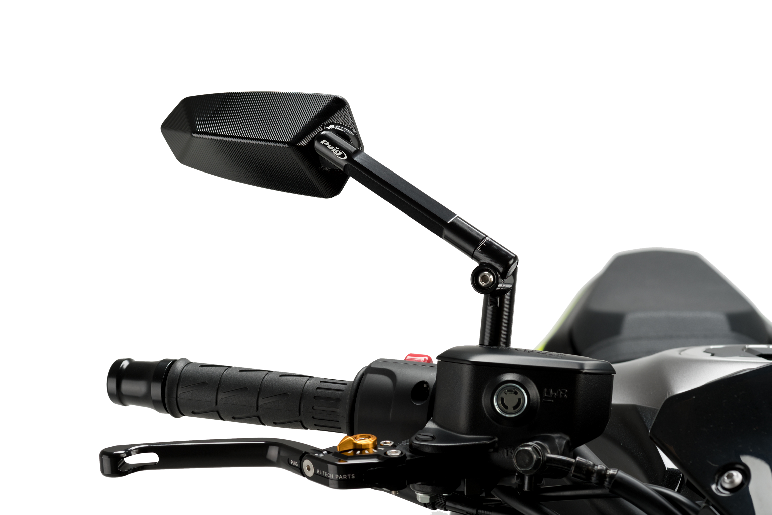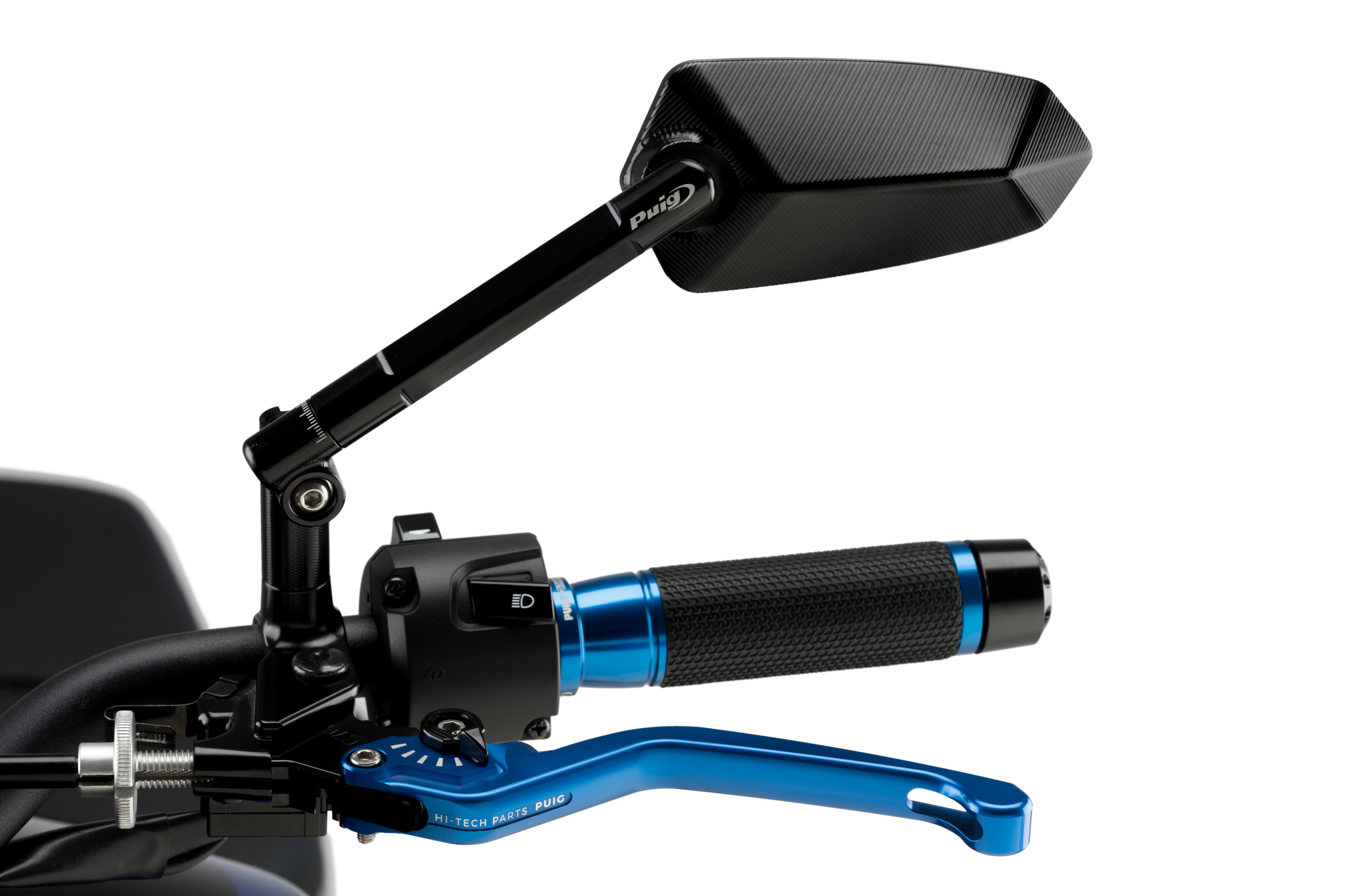 Se trata de piezas diseñadas bajo los parámetros de Hi-Tech parts de Puig, no homologados, regulables tanto en altura como inclinación gracias a su sistema de rótula “Ball and Socket Joint”. Además, serán adaptables a la varilla o al carenado original mediante adaptadores.