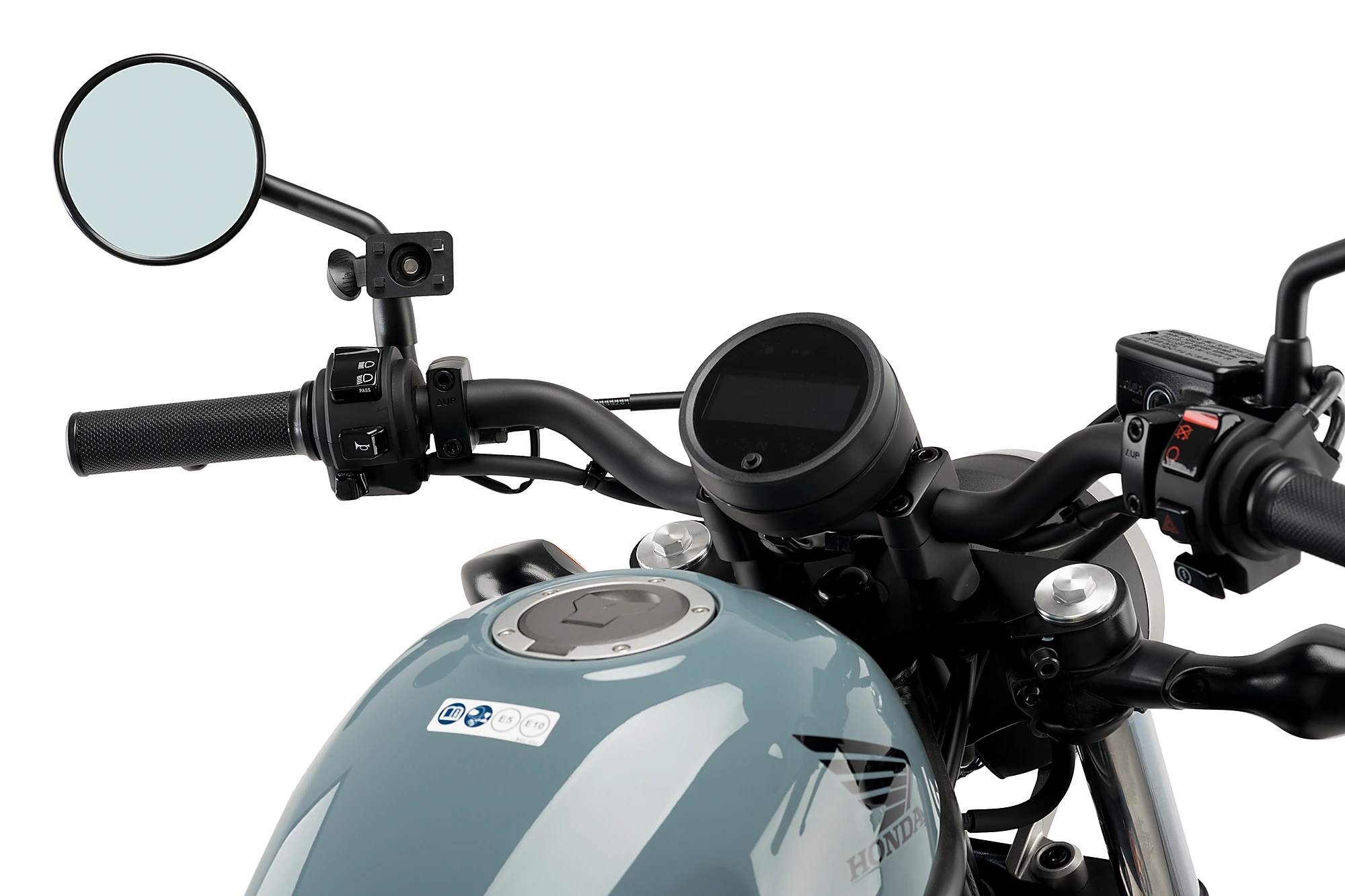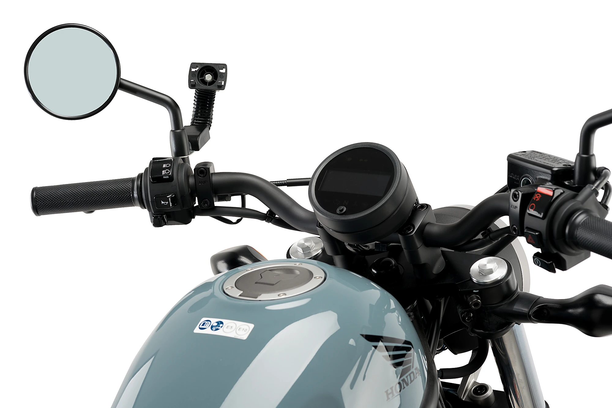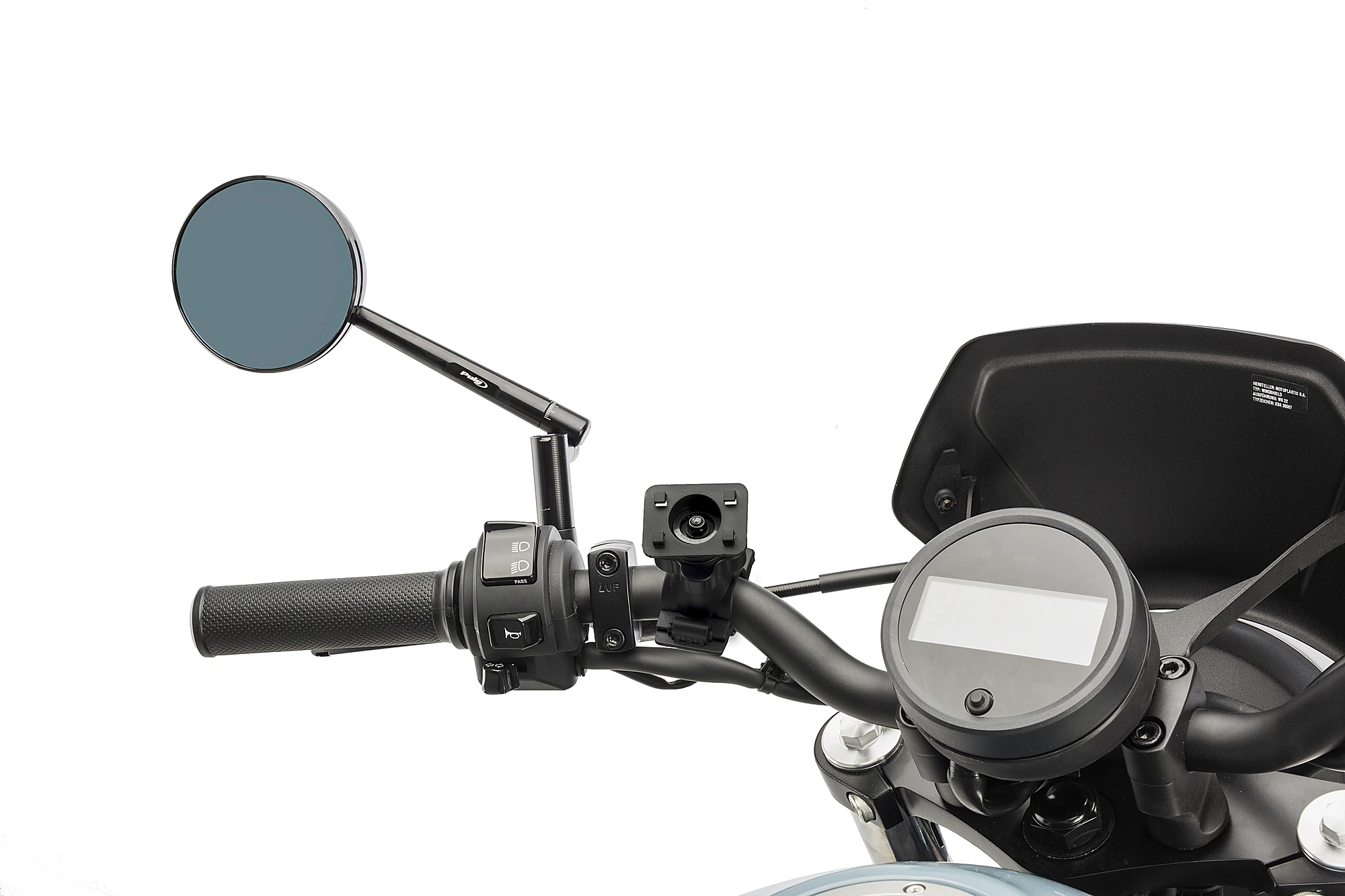 Puedes montar el portateléfono en la base del retrovisor, la varilla del retrovisor, en el manillar y en la tija de la moto donde quedará más inmovilizado frente a posibles impactos o baches de la carretera.