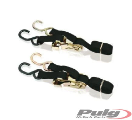 Développées spécifiquement pour le transport de motos, ces sangles sont fabriquées dans des matériaux de haute résistance, capables de résister aux fortes tensions et à l’inertie auxquelles toute charge est soumise lorsqu’elle se déplace dans un véhicule. Puig propose dans son catalogue un ensemble de sangles à crochets qui permettent un ajustement parfait à tout type de transport et avec lesquelles l'immobilisation complète de la moto est obtenue.