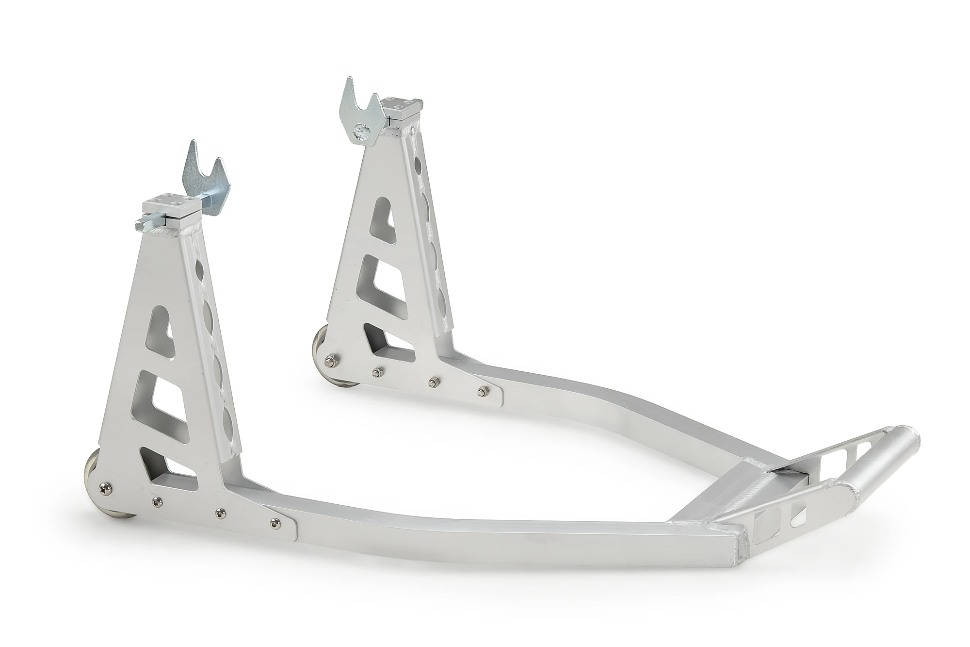 Fabriquée en aluminium, elle se distingue par sa structure ultra-légère sans compromettre la résistance. Elle intègre des roues en caoutchouc directement dans la béquille, facilitant la manœuvre et assurant un déplacement fluide et précis.