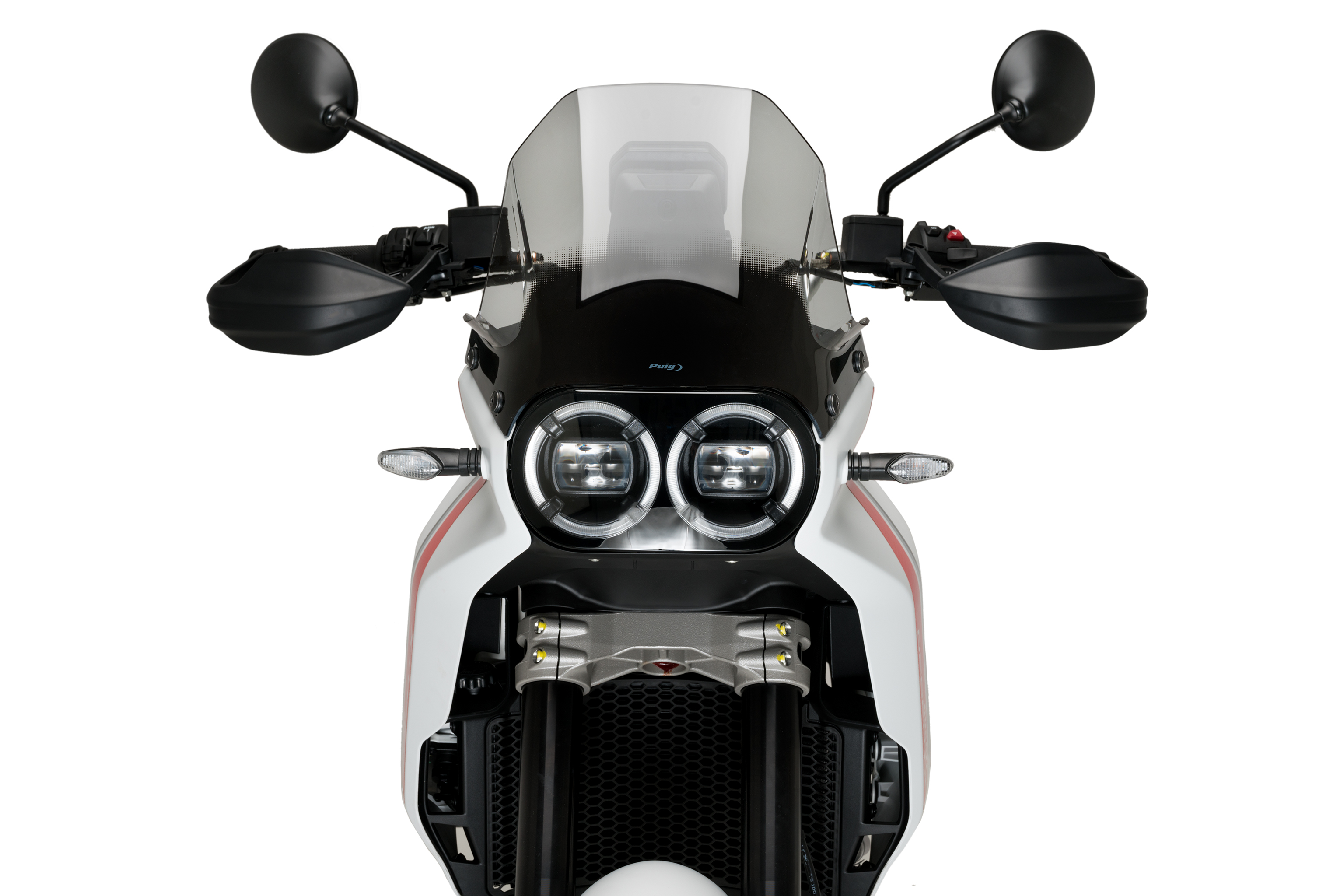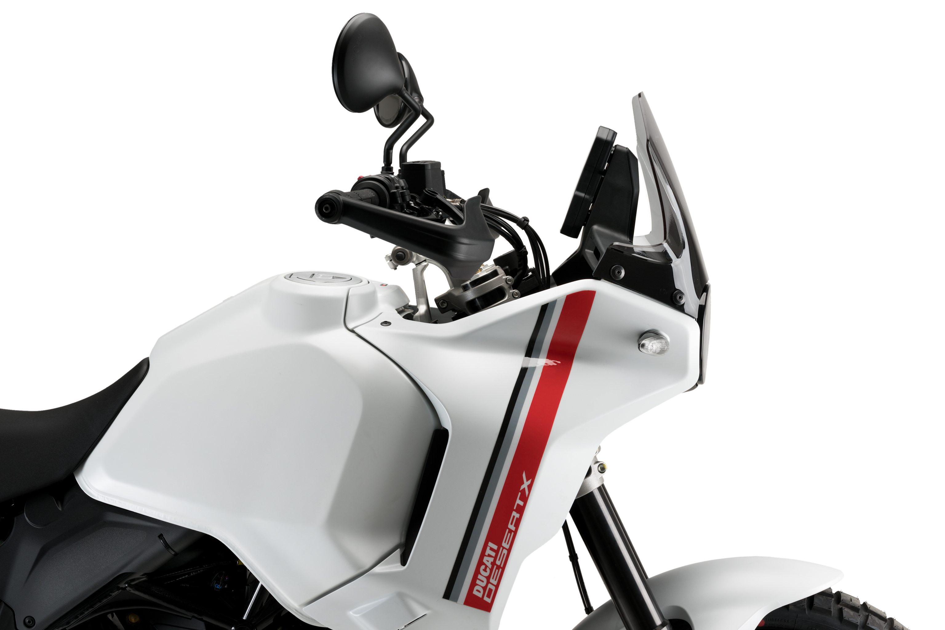 Avec des dimensions globales de 320 mm de haut sur 365 mm de large, la bulle Sport PUIG est 70 mm plus basse que celle de la Ducati Desert X.