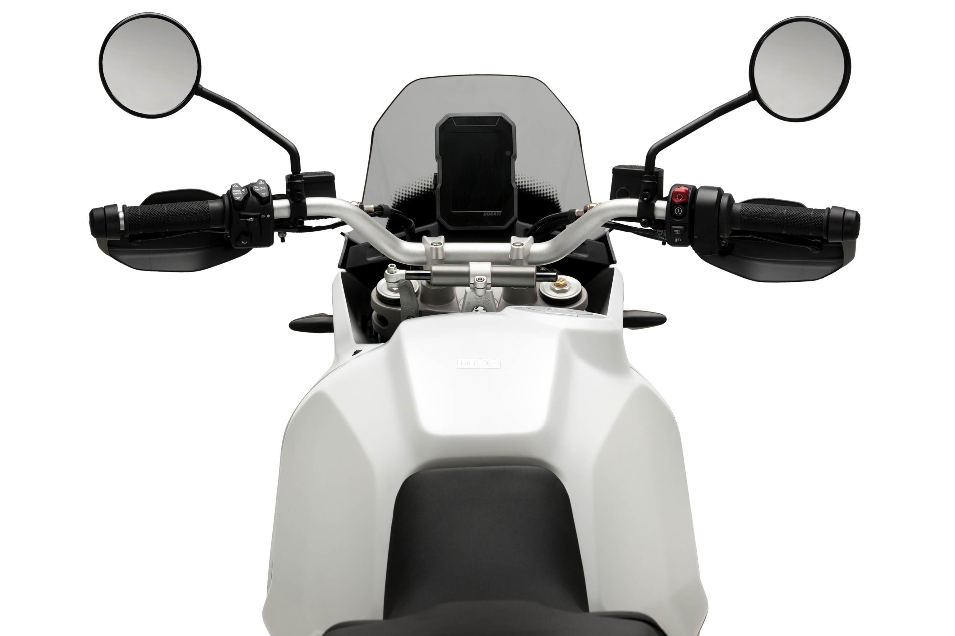 La zone inférieure de l'écran est peinte pour cacher le câblage intérieur, montrant un dégradé plus discret et classique que l'original qui se marie mieux avec la moto. Laissant voir le logo Ducati sur le devant.