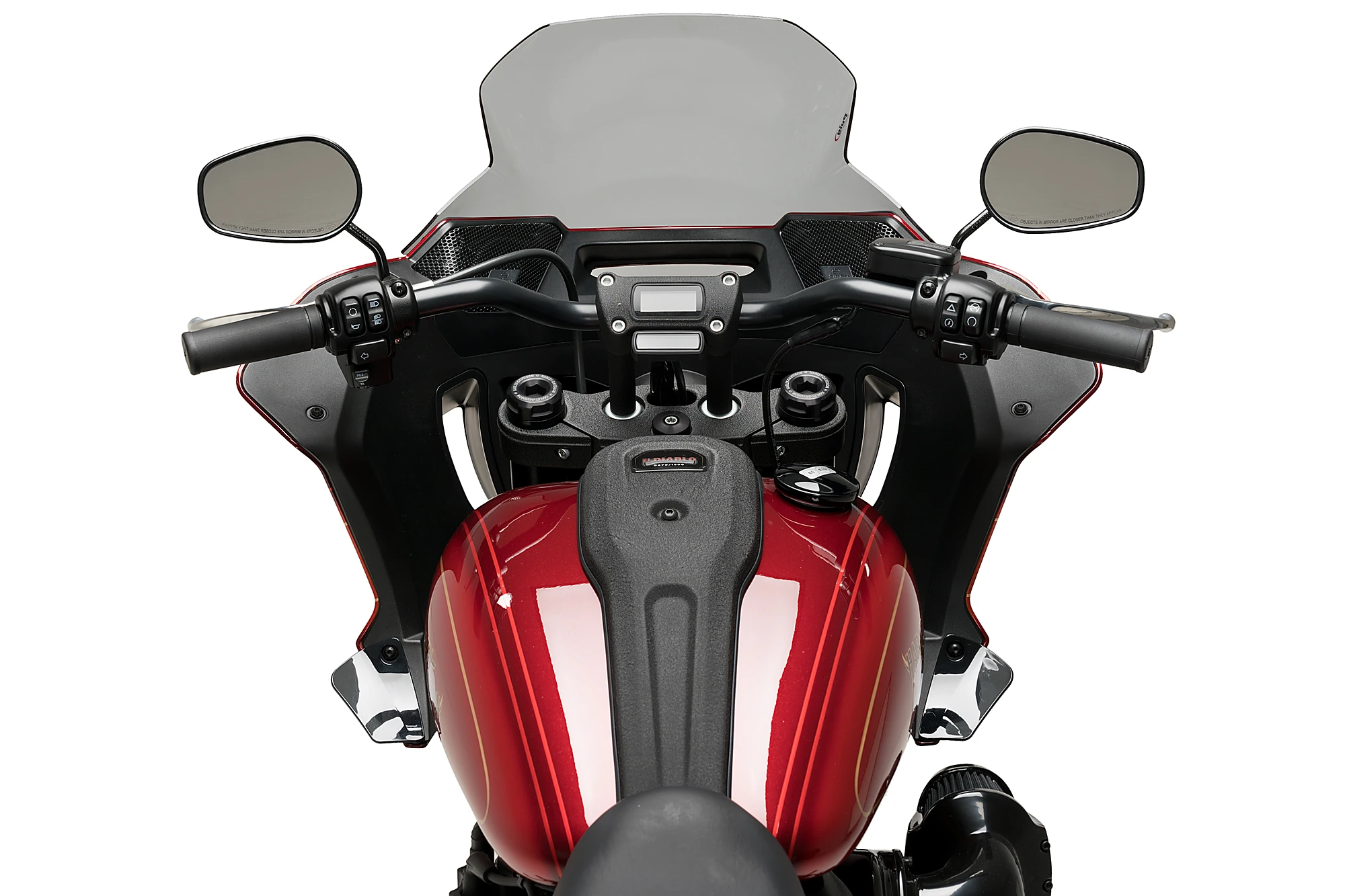 Le pare-brise Touring est conçu pour davantage d'utilisateurs de la route qui souhaitent augmenter la protection aérodynamique, 15% d'amélioration, sans renoncer à un look sportif. Plus grand que l'écran d'origine, ses formes latérales ont été conçues pour mieux dévier l'air de la zone des épaules du pilote, évitant les flux d'air gênants, réduisant la fatigue et améliorant le confort de conduite. Le dessus est plat pour assurer une plus grande visibilité. Il est disponible en transparent, fumé clair et fumé foncé.