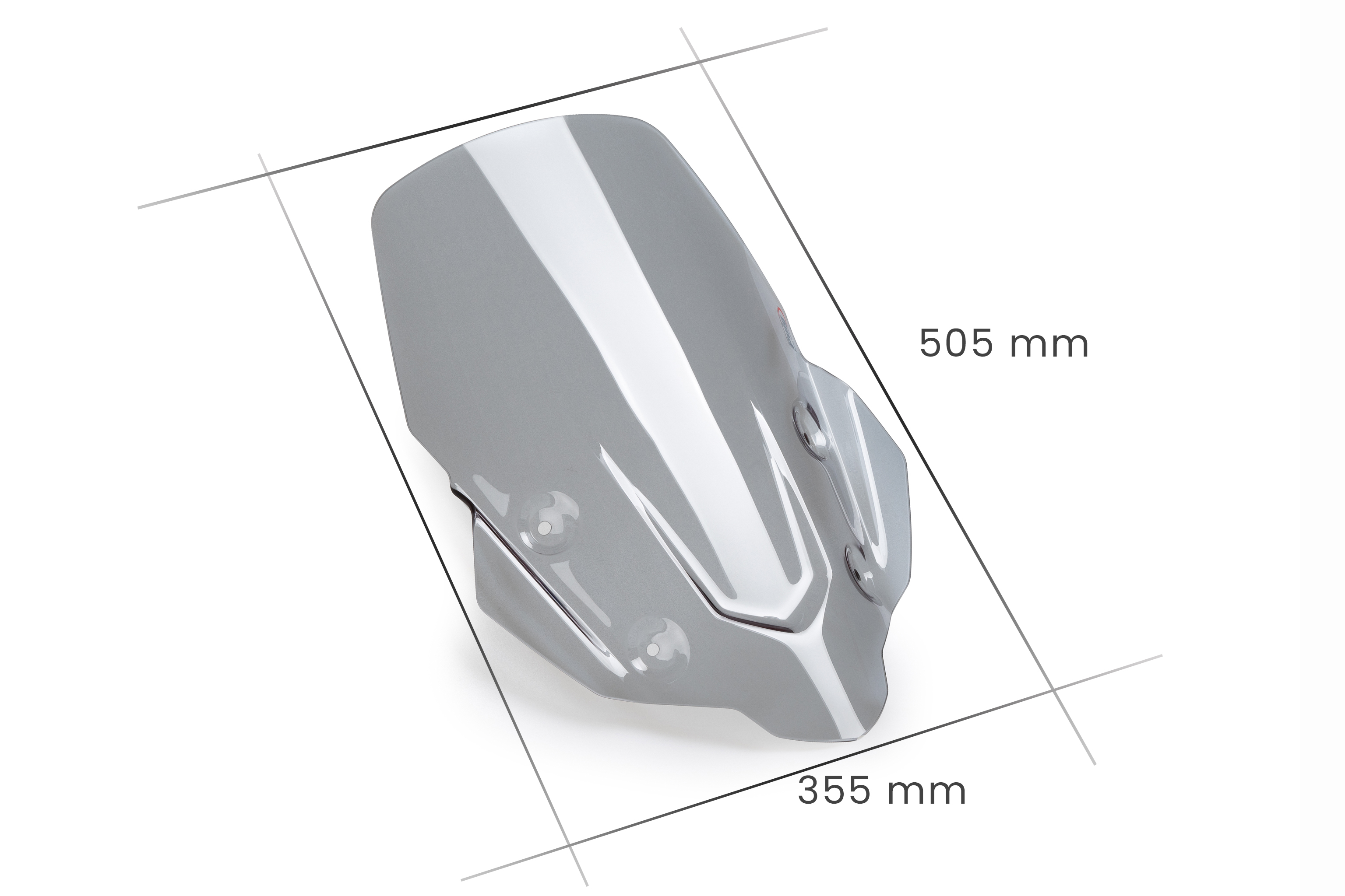 Ses mesures totales sont de 355 mm de largeur sur 505 mm de hauteur. Étant 90 mm plus haut que la bulle Honda d'origine.