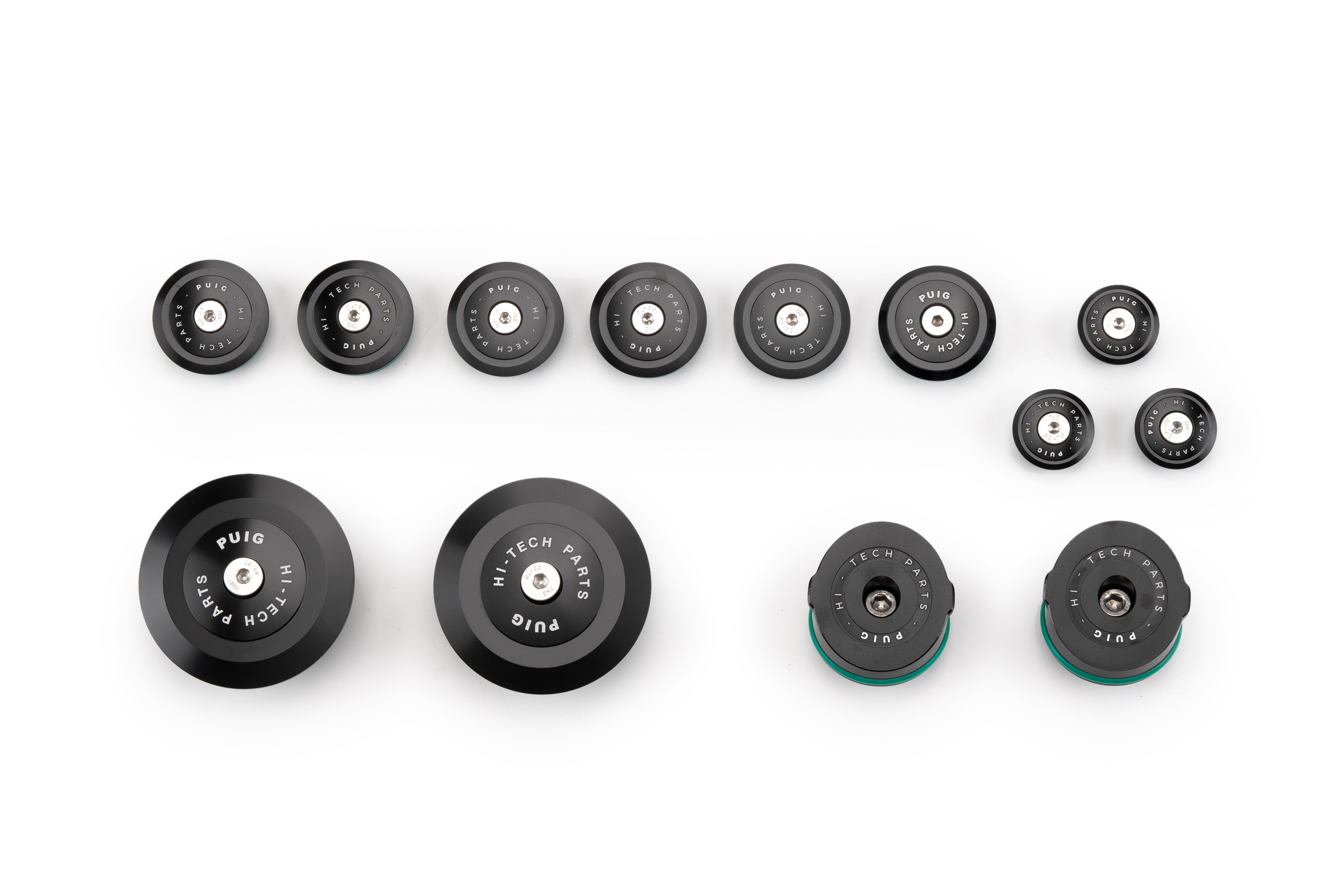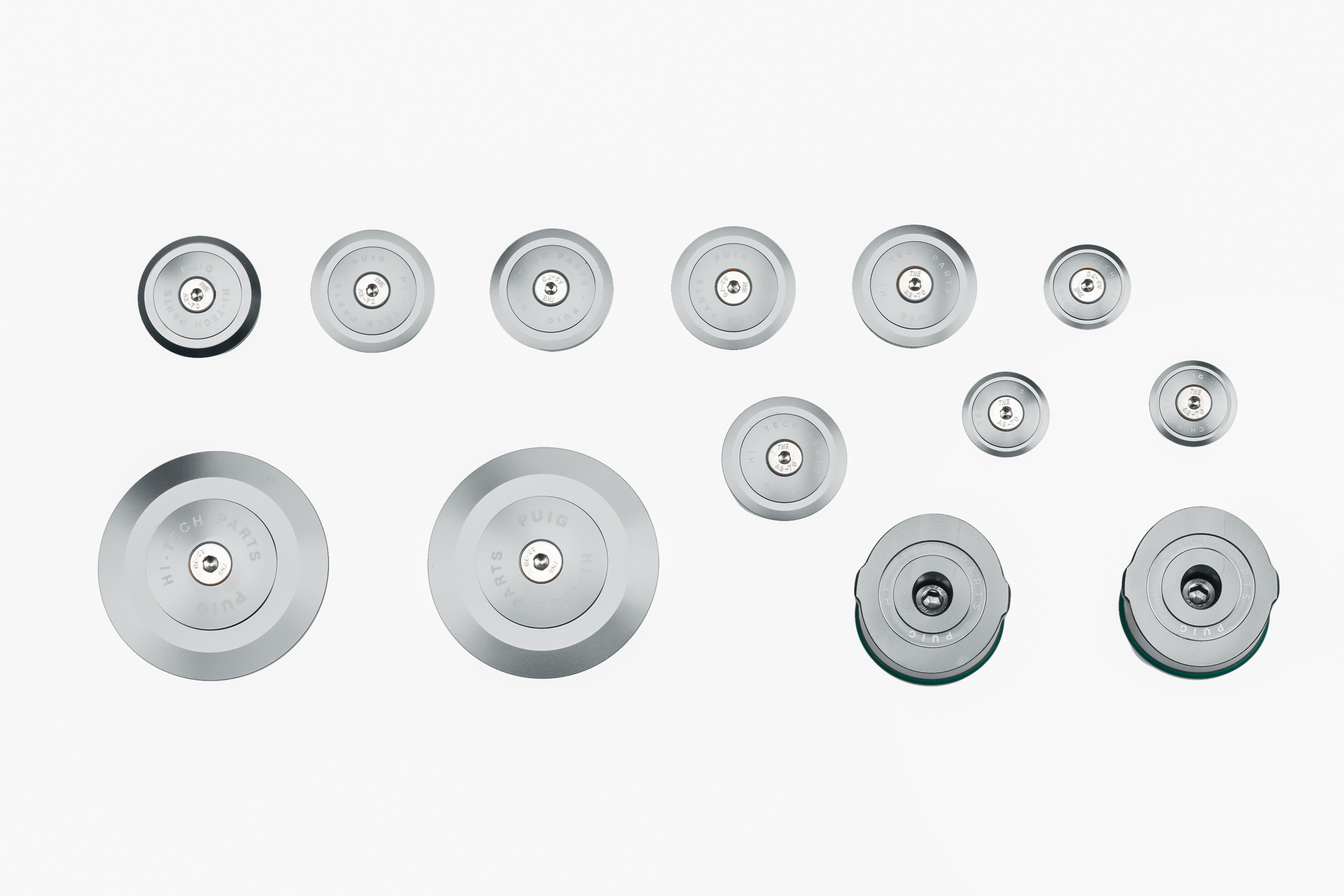 Conçus et développés par Puig, ils sont usinés à partir d'un seul bloc d'aluminium avec une finition anodisée noire, et ont des logos gravés au laser pour créer une finition parfaite.