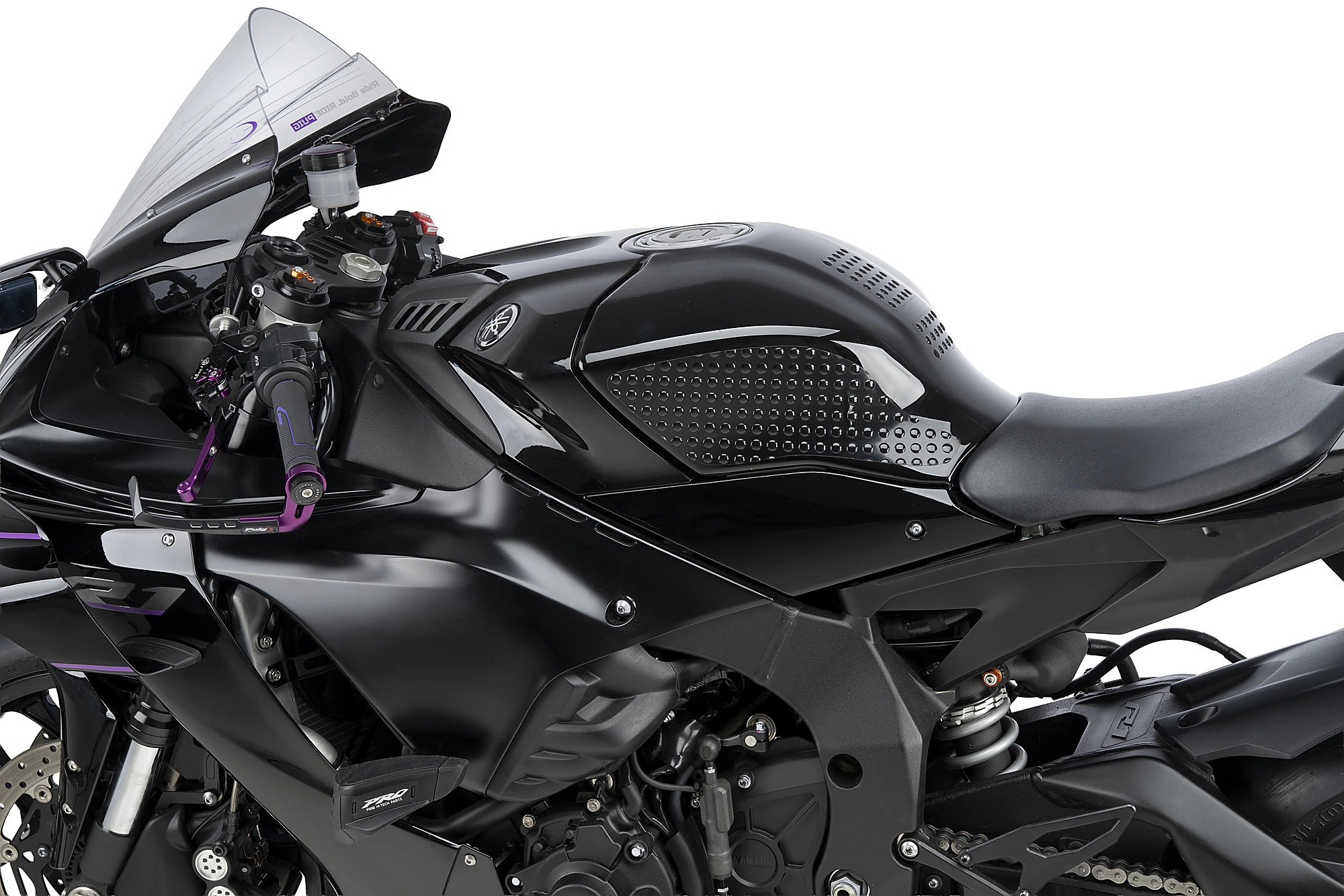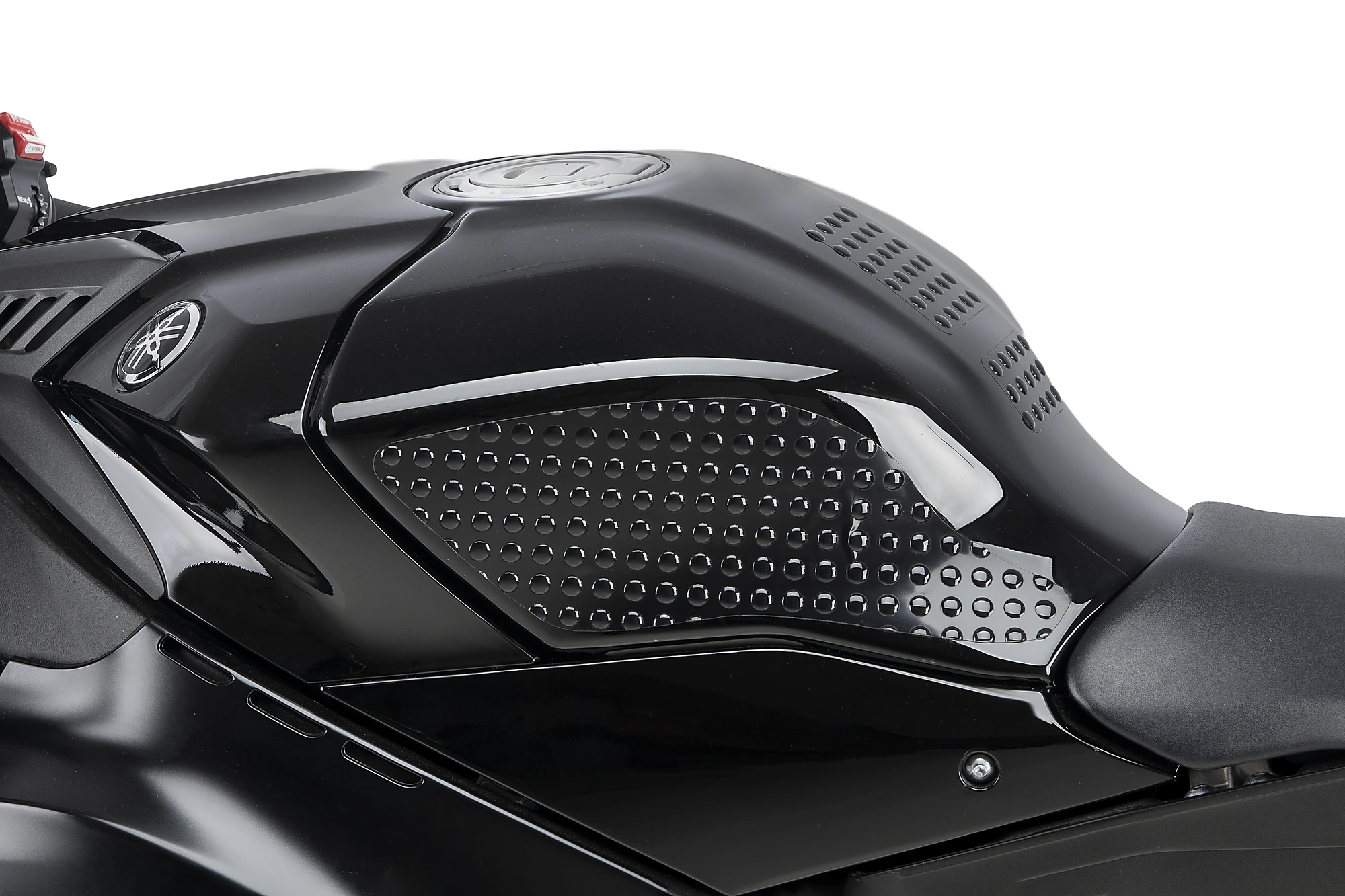 Il s’agit d’un produit extrêmement fin et discret, avec uniquement les “dimples” visibles, conçus pour offrir une meilleure adhérence dans la zone centrale du réservoir, particulièrement utile lors de freinages brusques ou de conduite sportive. Le reste du matériau est quasiment invisible, assurant une intégration visuelle parfaite.