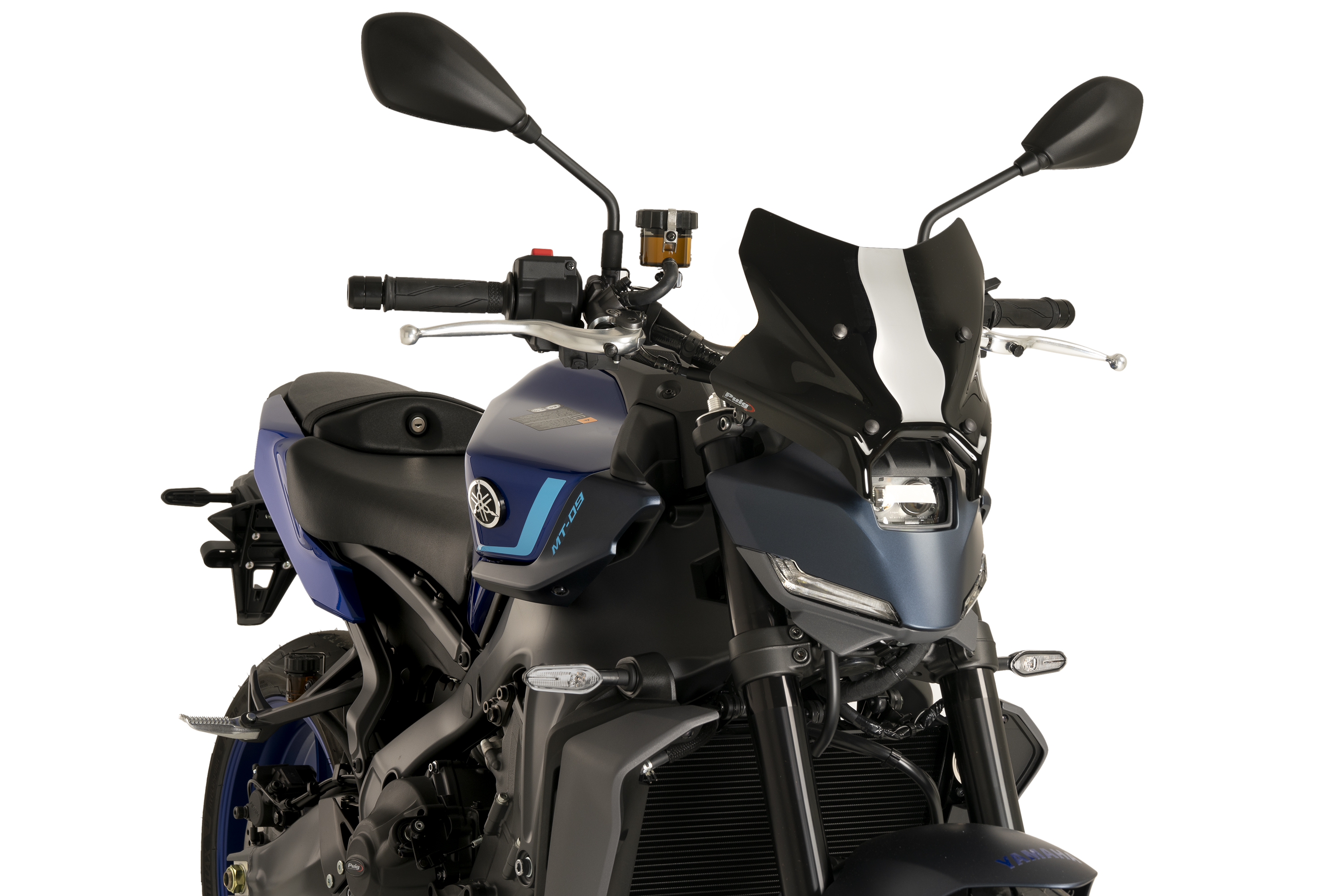 Le pare-brise New Generation Sport est idéal pour les utilisateurs qui souhaitent améliorer l'esthétique de leur moto tout en améliorant la protection aérodynamique. Il offre une visibilité totale au-dessus de lui, se distinguant par son design agressif avec des côtés prononcés qui accentuent les lignes diagonales issues de la lumière avant de la Yamaha MT-09.