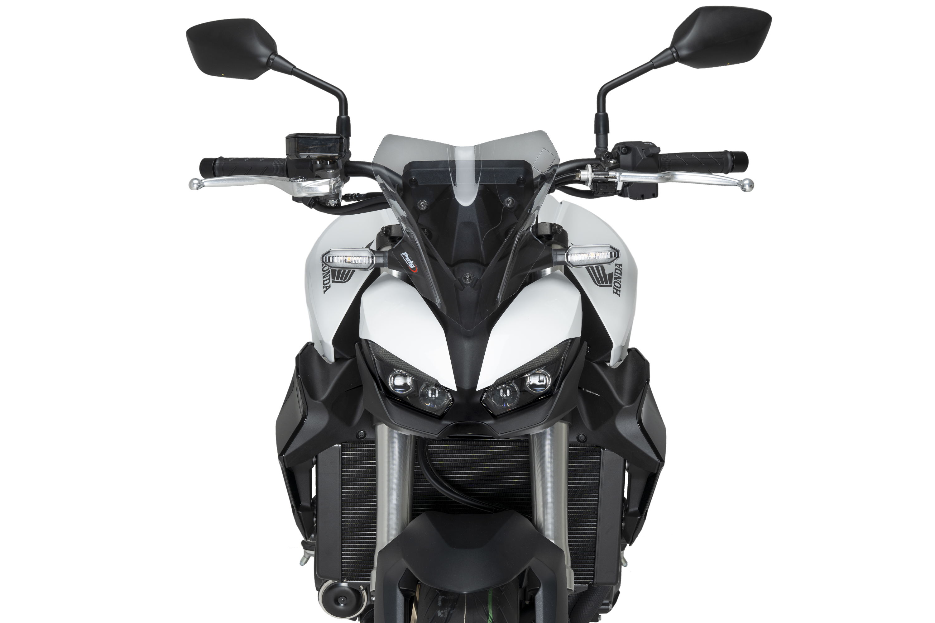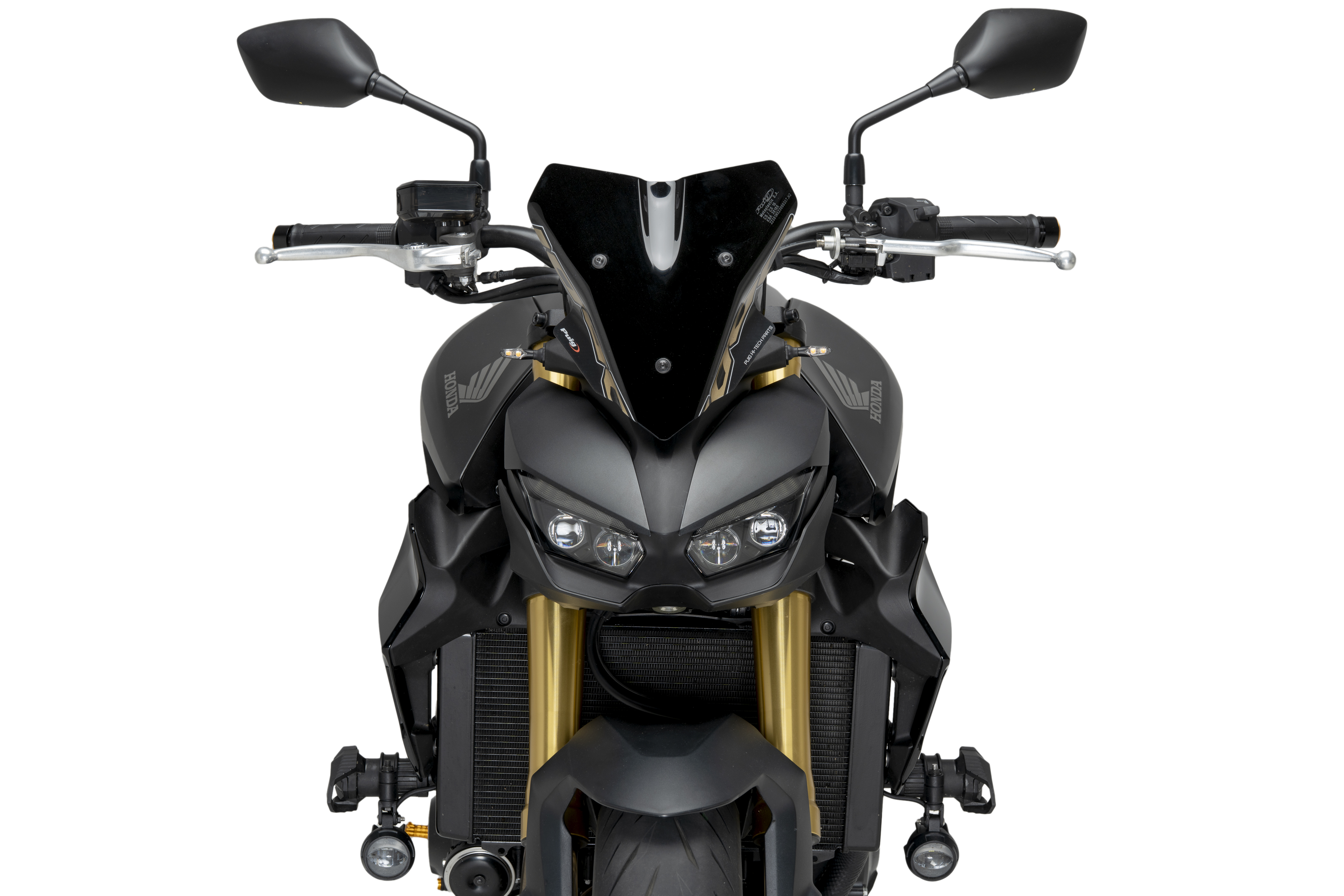 Au centre, deux lignes définies parcourent la bulle, s’alignant visuellement avec le design frontal de la CB1000 Hornet. Ce jeu de formes et de volumes permet une parfaite fusion visuelle entre la bulle et la carrosserie, accentuant la présence sportive de la moto.