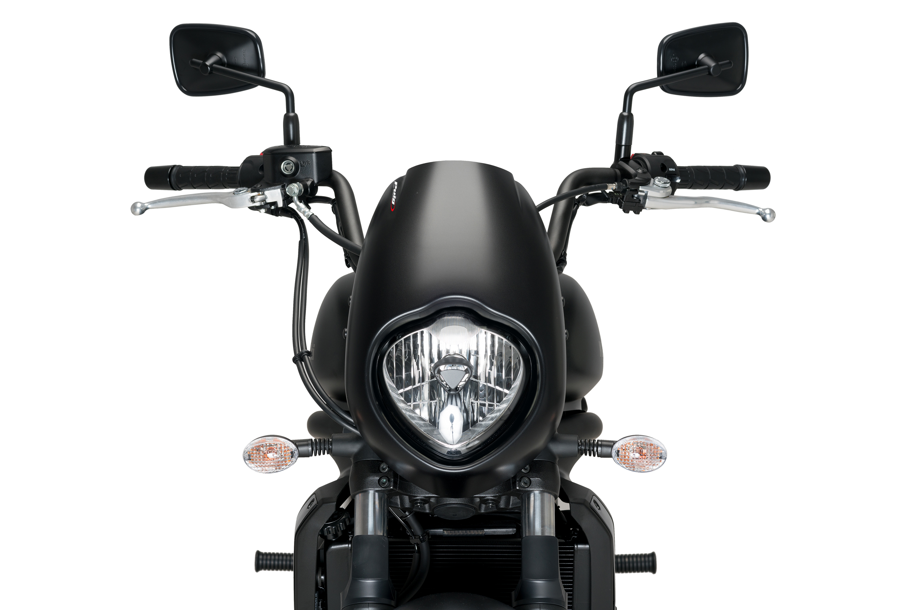 Fabriquée avec des matériaux très résistants aux chocs et avec une grande capacité aérodynamique, cette pièce est disponible pour les modèles de motos Harley Davidson, indiennes et japonaises, conçue spécifiquement pour chaque modèle de moto, elle s'adapte parfaitement au phare, soit rond ou avec une  forme, comme dans le cas du modèle Vulcan S.