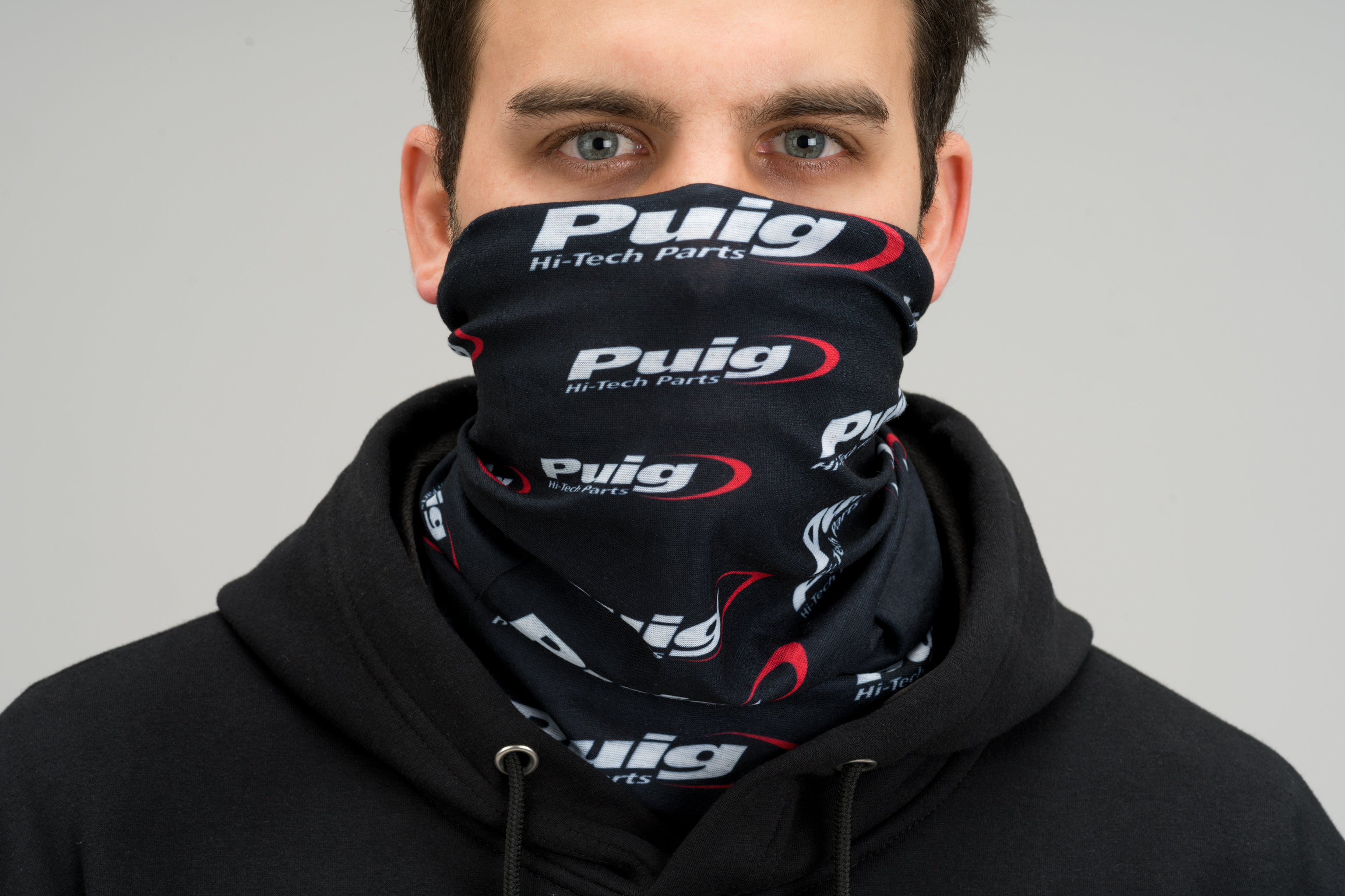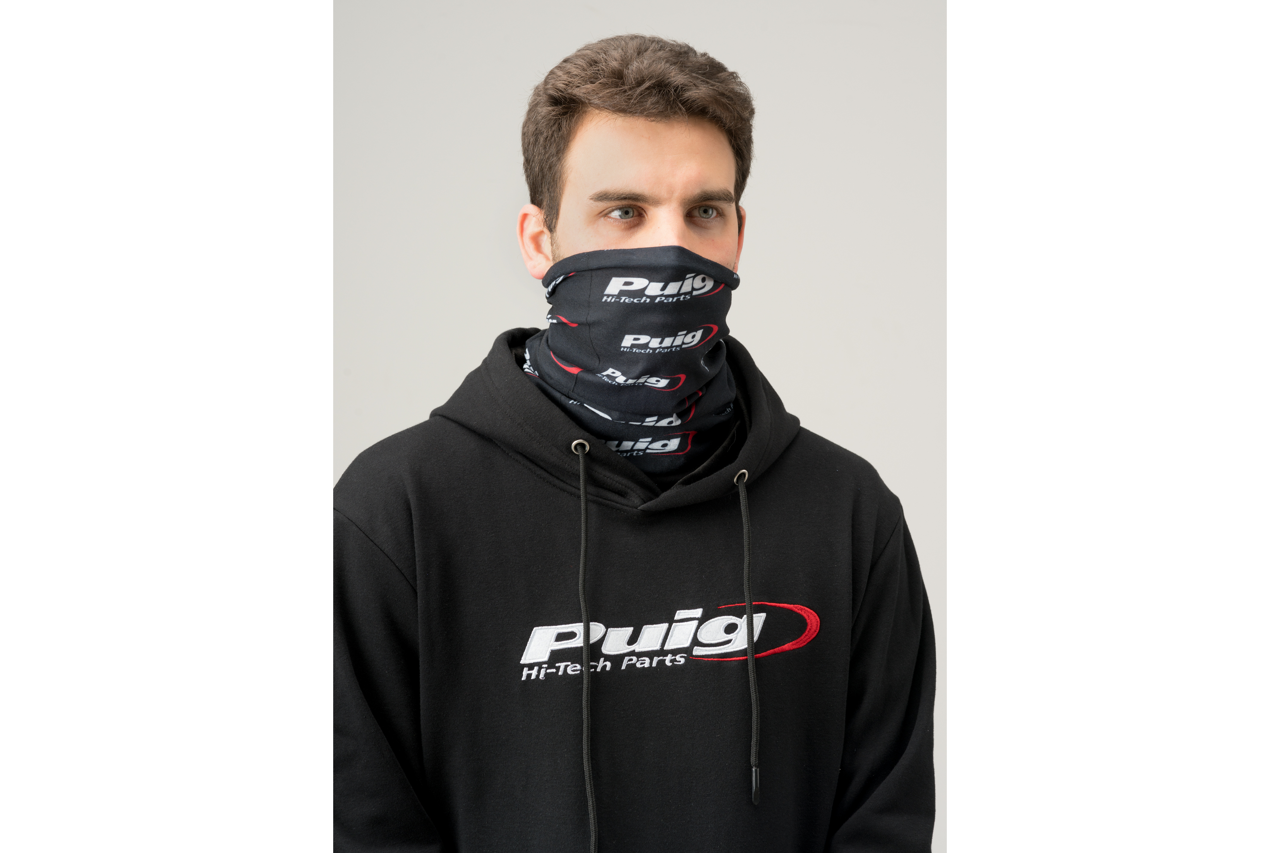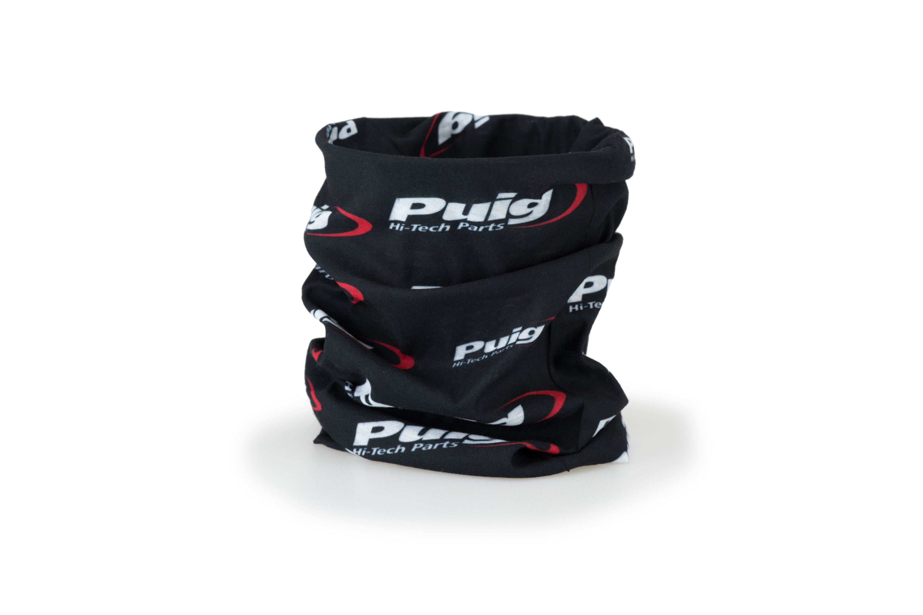 Le catalogue Puig dispose d'une ligne d'équipement pour le motard, composée de vêtements et accessoires tels que ce tour de cou, décoré du logo Puig Hi-Tech Parts.