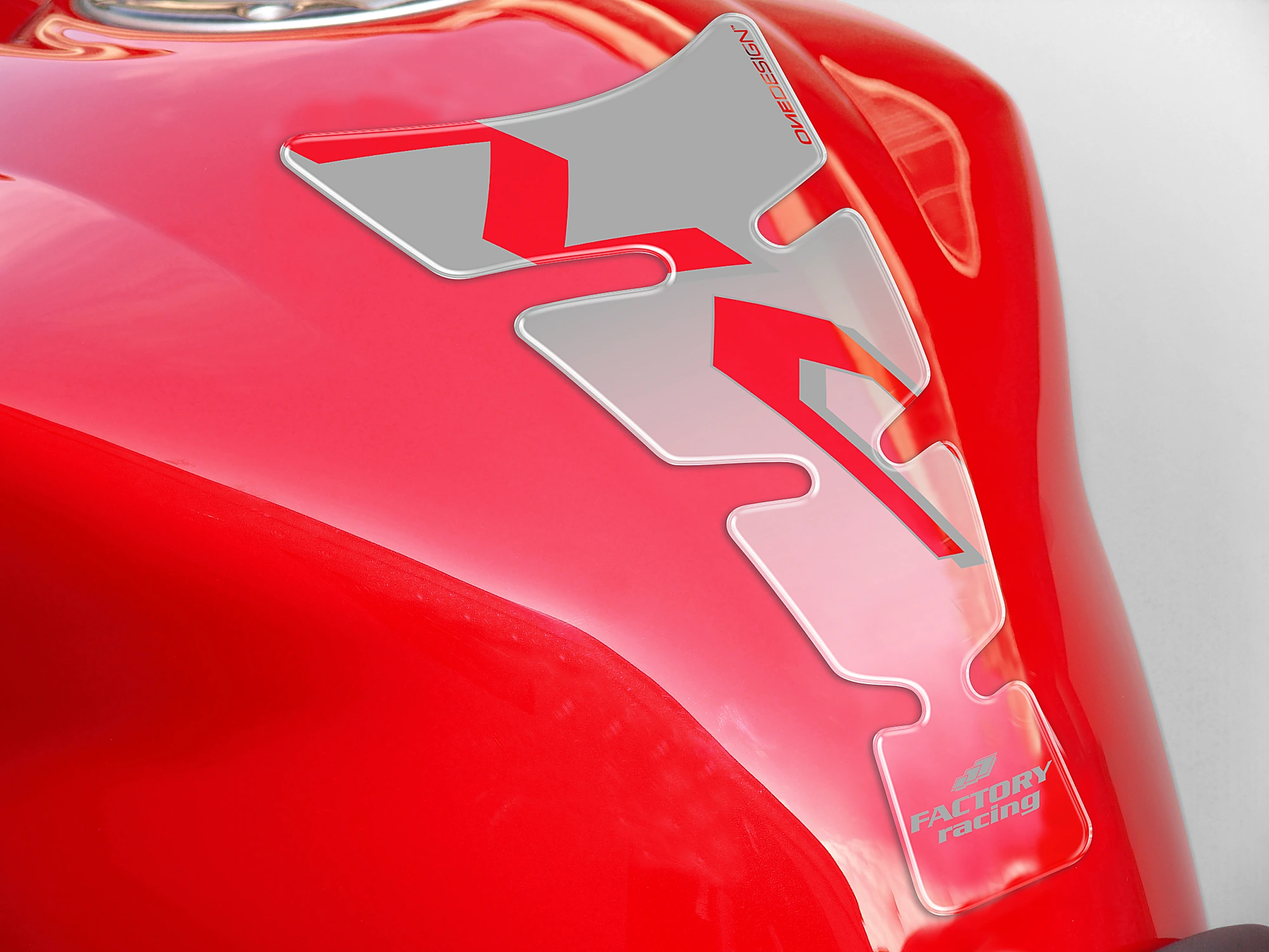 Adesivo protezione serbatoio con una forma standard che caratterizza il modello di moto nella sezione centrale, sia nero o argento a seconda del colore del serbatoio della moto. Abbiamo due colori: nero e argento.