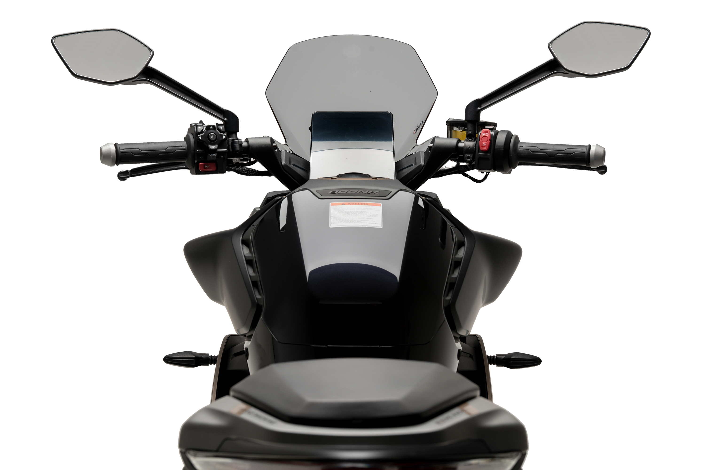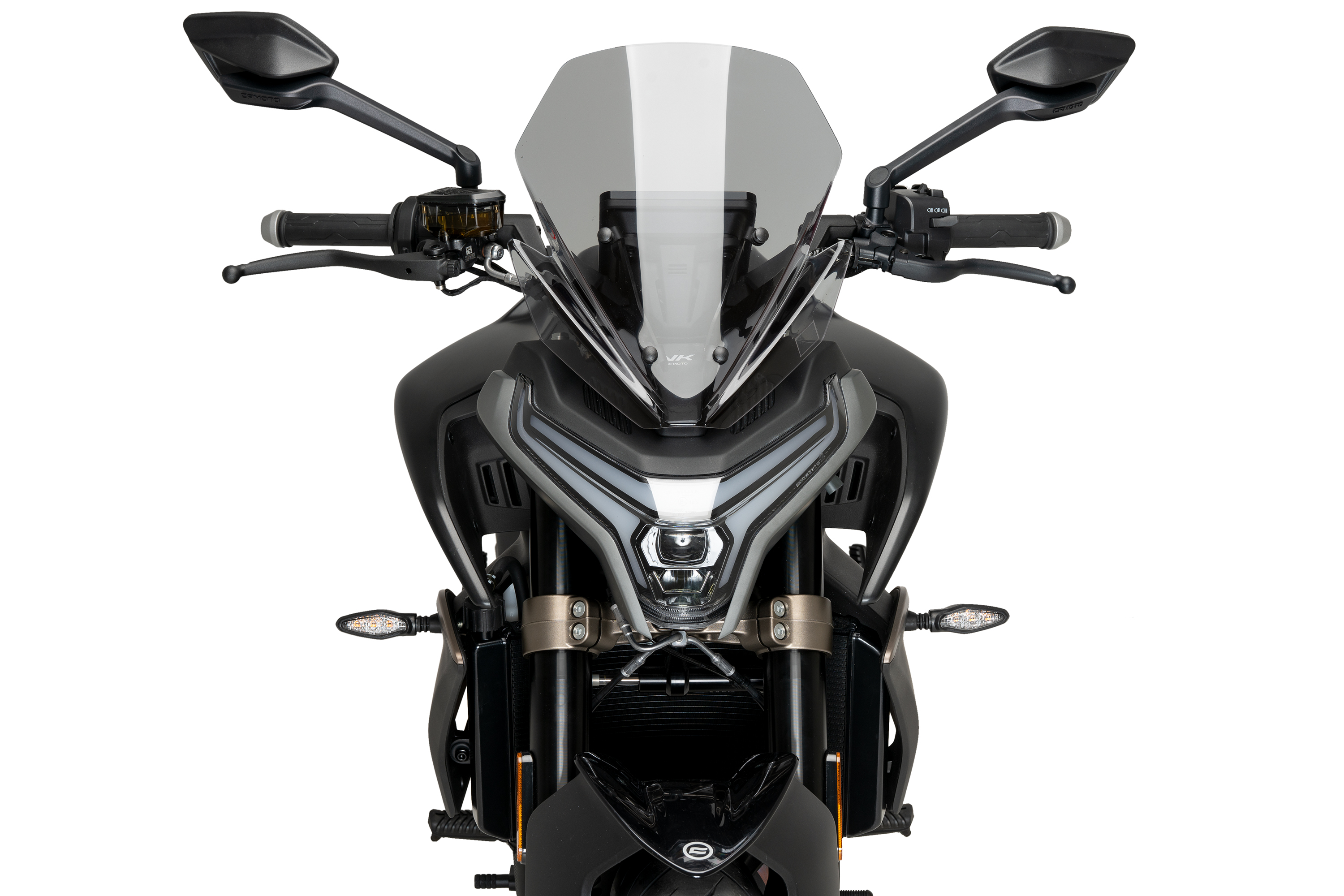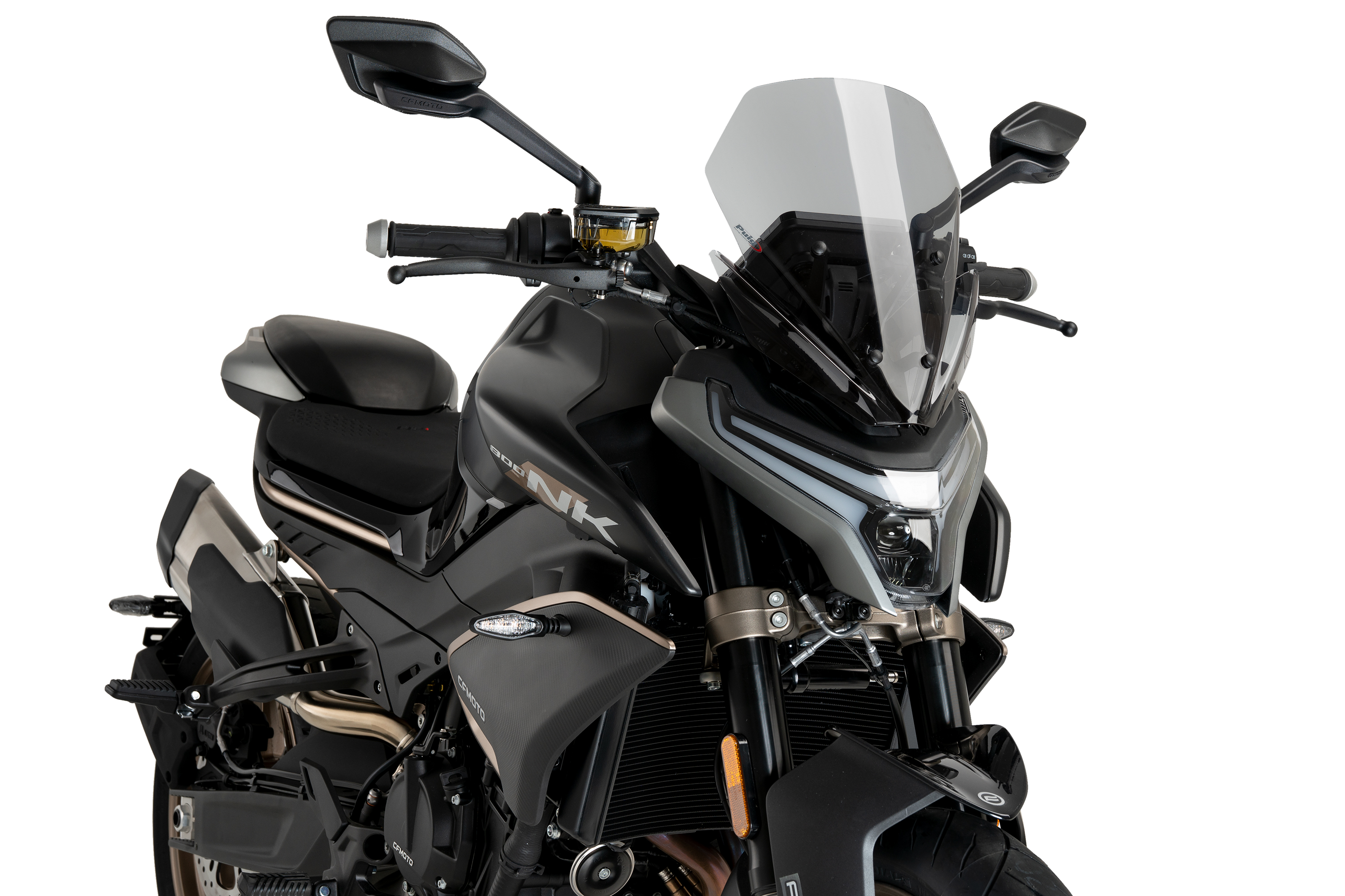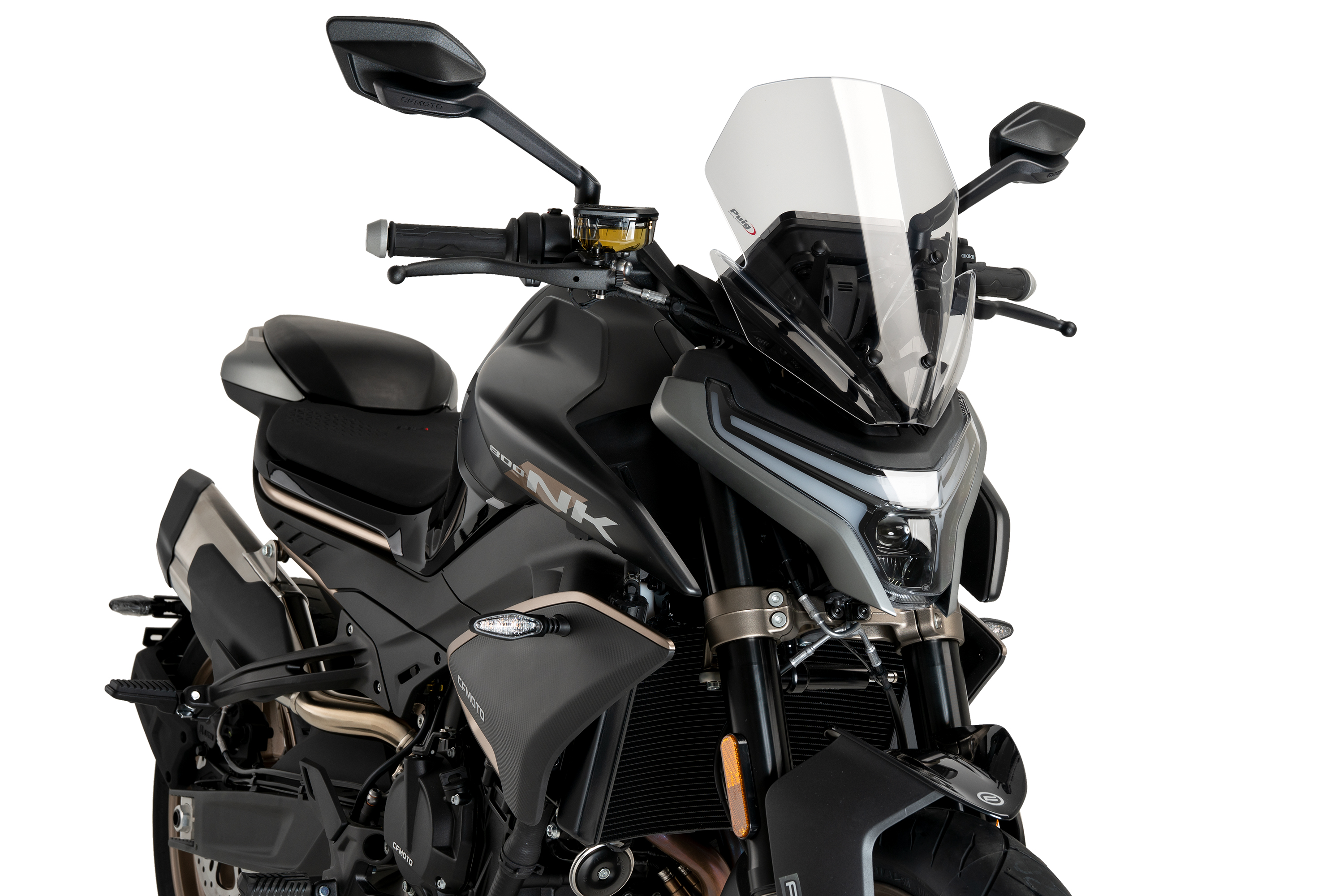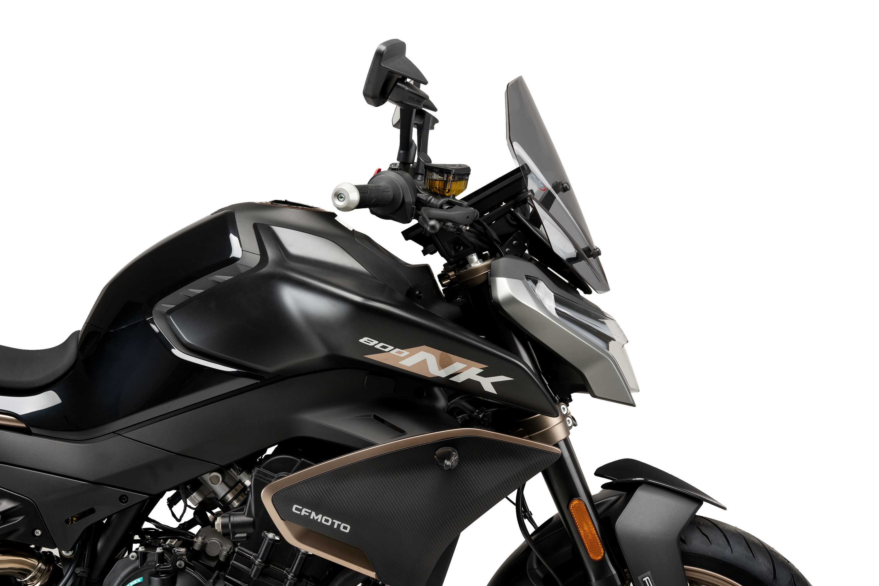 Per ottenere un look più aggressivo, Puig ha progettato il parabrezza New Generation sport per la CF Moto 800NK: caratterizzato da due nervature molto pronunciate che si estendono dalla parte anteriore della moto ai lati. Il design di questo parabrezza copre completamente l'area del contagiri, adattandosi perfettamente alla forma frontale. Le sue forme laterali sono state concepite per dissipare meglio l'aria che colpirebbe direttamente le mani, offrendo maggiore comfort nella guida e un notevole miglioramento aerodinamico.