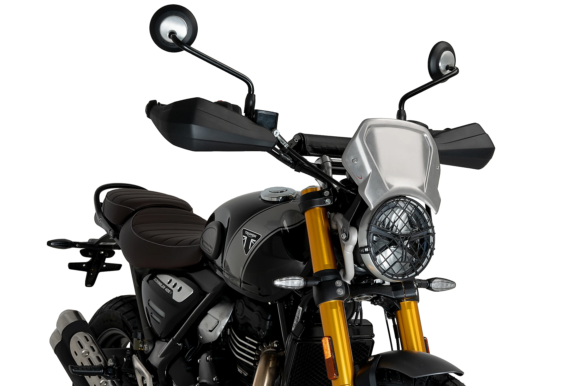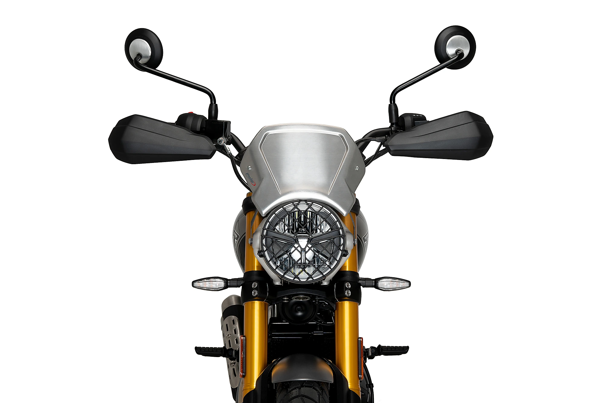 Per quanto riguarda il montaggio, la carenatura frontale in alluminio Puig ha due punti di ancoraggio e un supporto di ferro universale. PUIG ha anche supporti specifici se ne avete bisogno per il vostro modello di moto.