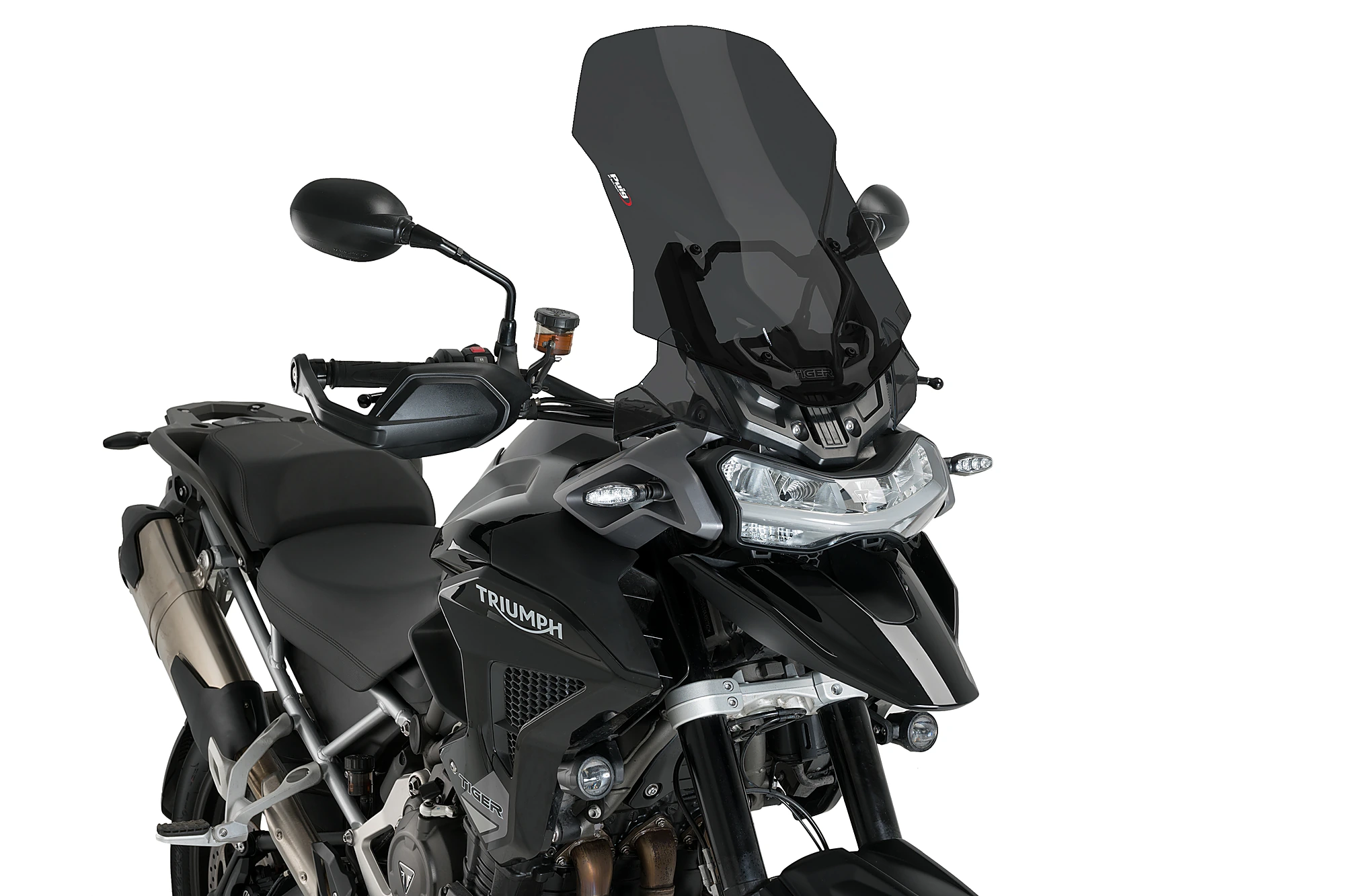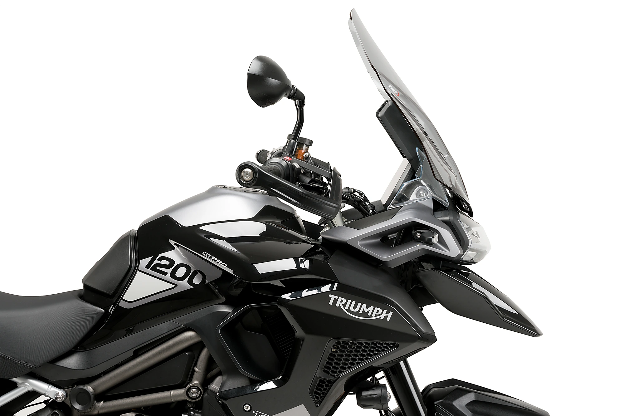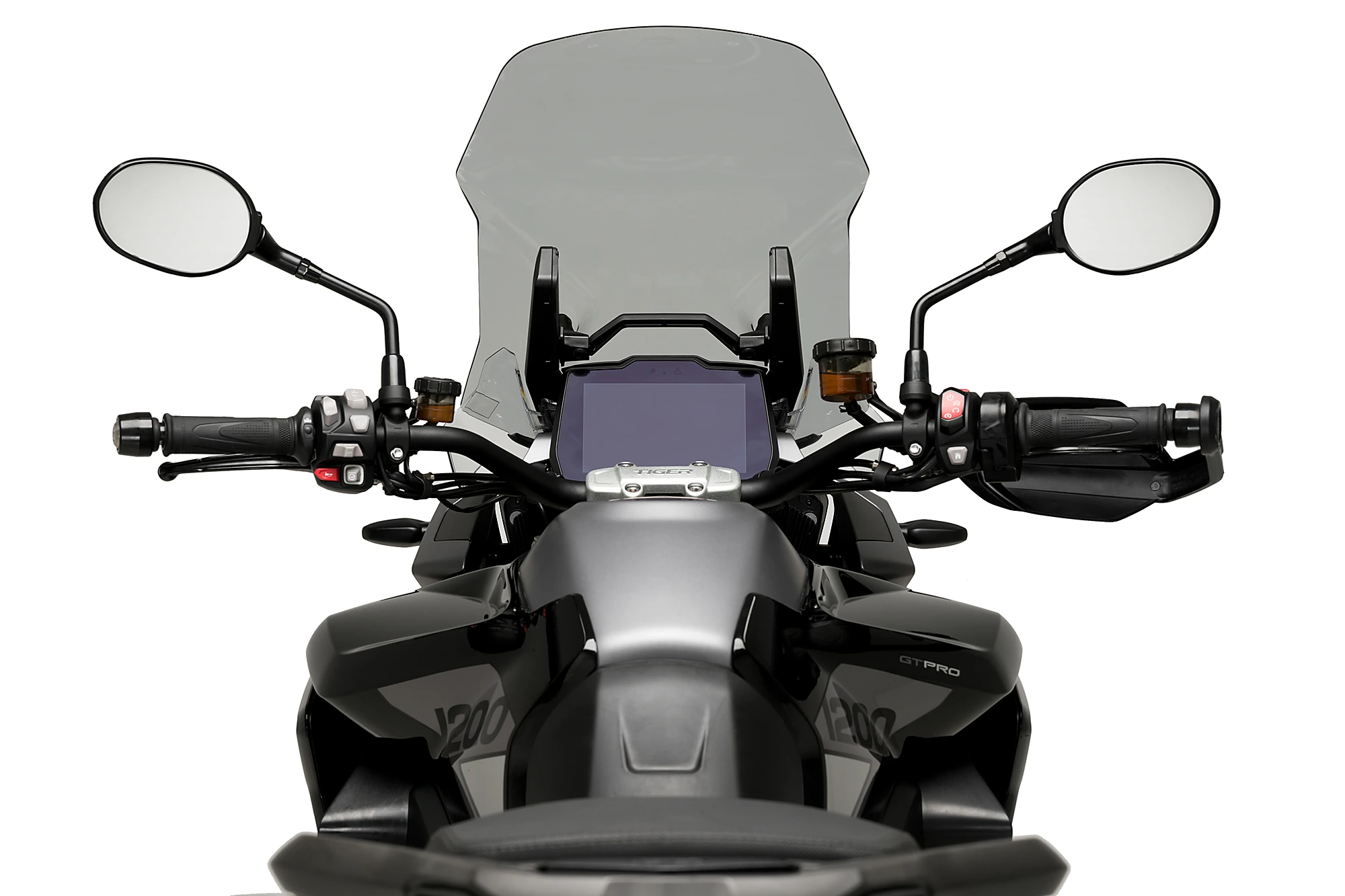Le sue misure totali sono 530 mm di altezza per 395 mm di larghezza. Lo schermo da turismo di Puig è 80 mm più alto dello schermo originale della Triumph Tiger 1200 del 2022.