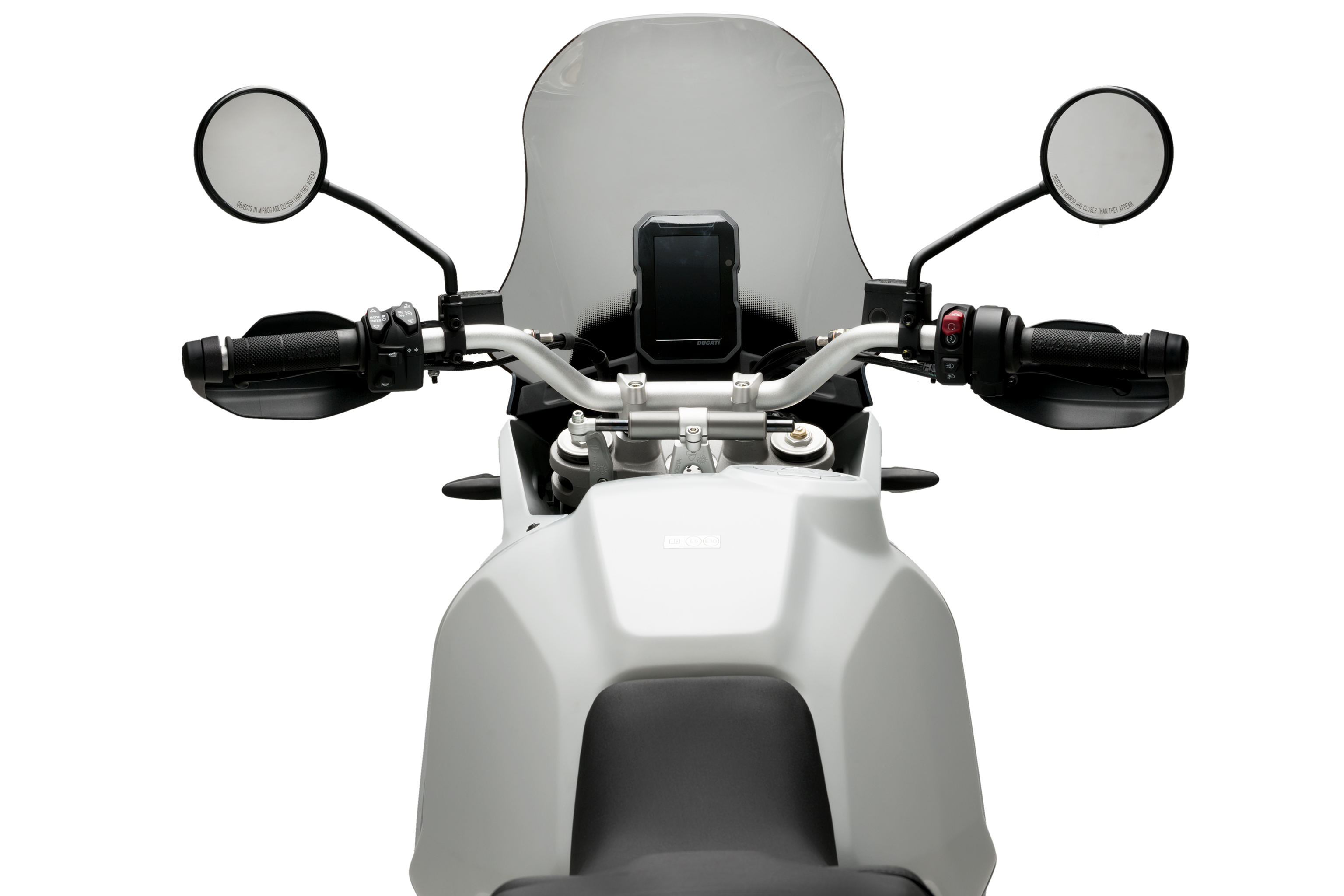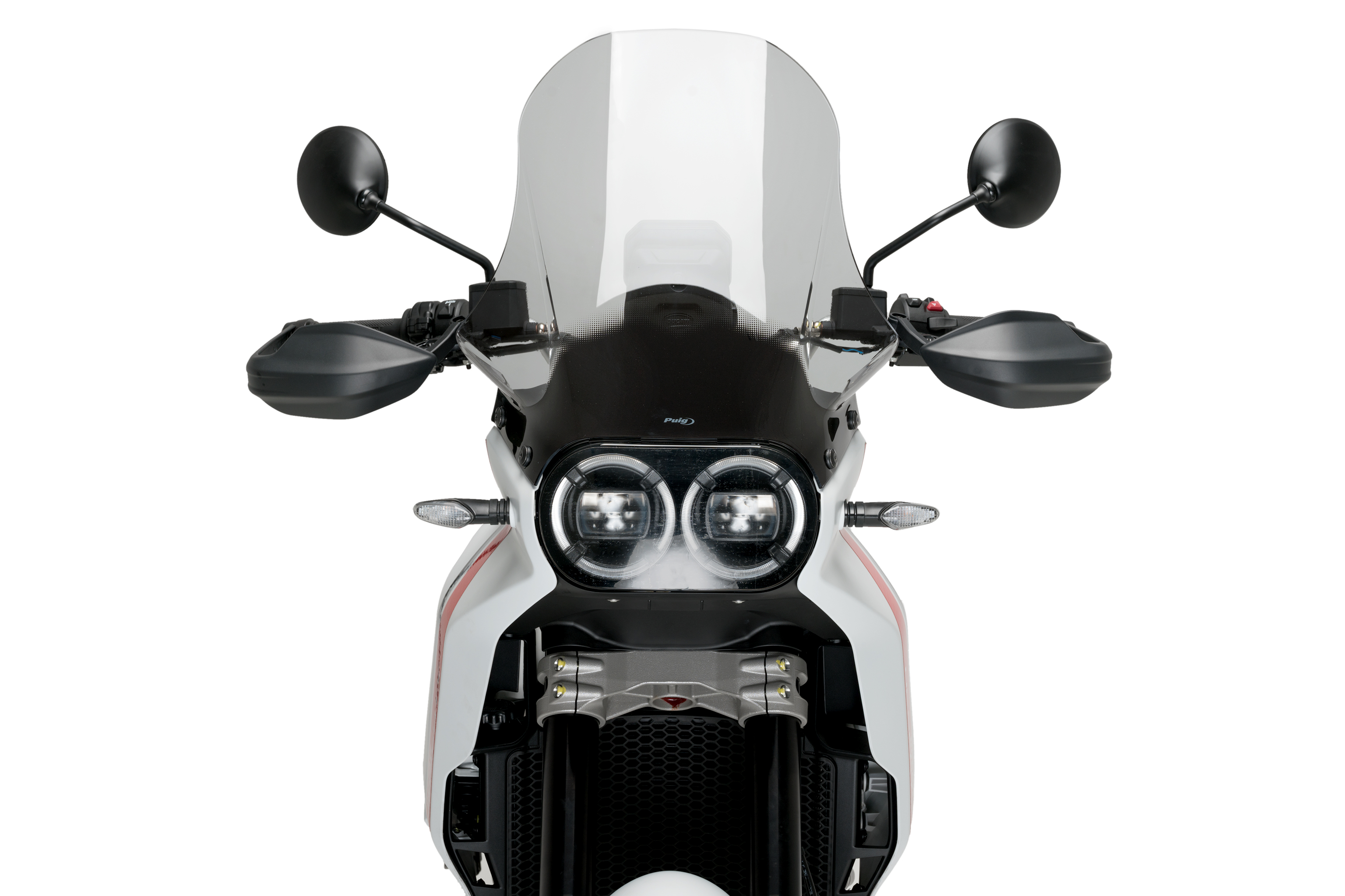Con misure complessive di 440 mm di altezza per 480 mm di larghezza, il cupolino Puig Sport è 90 mm più alto di quello della Ducati Desert X.