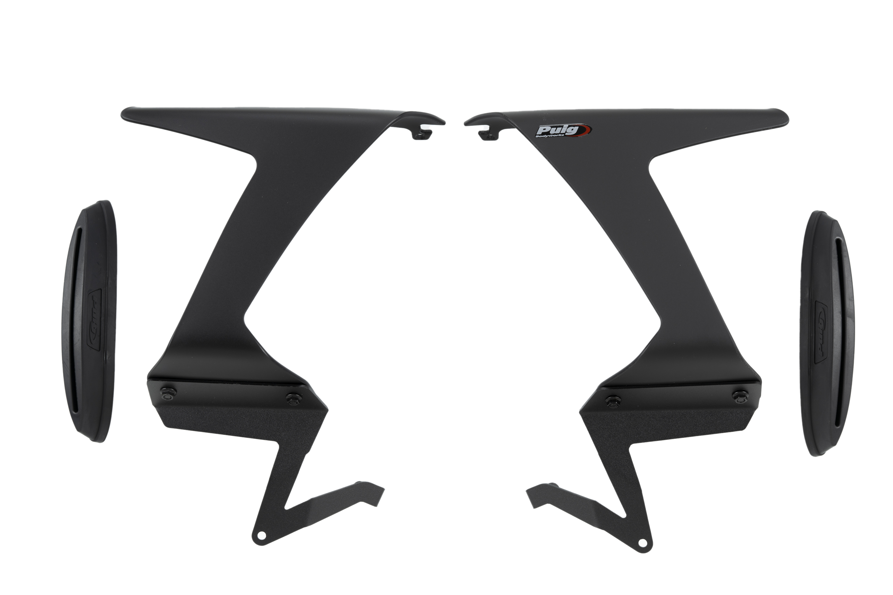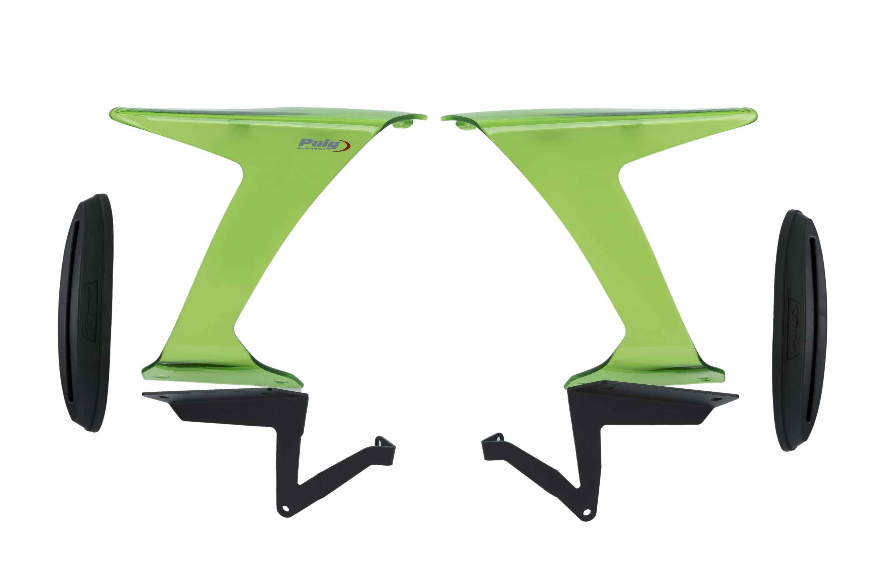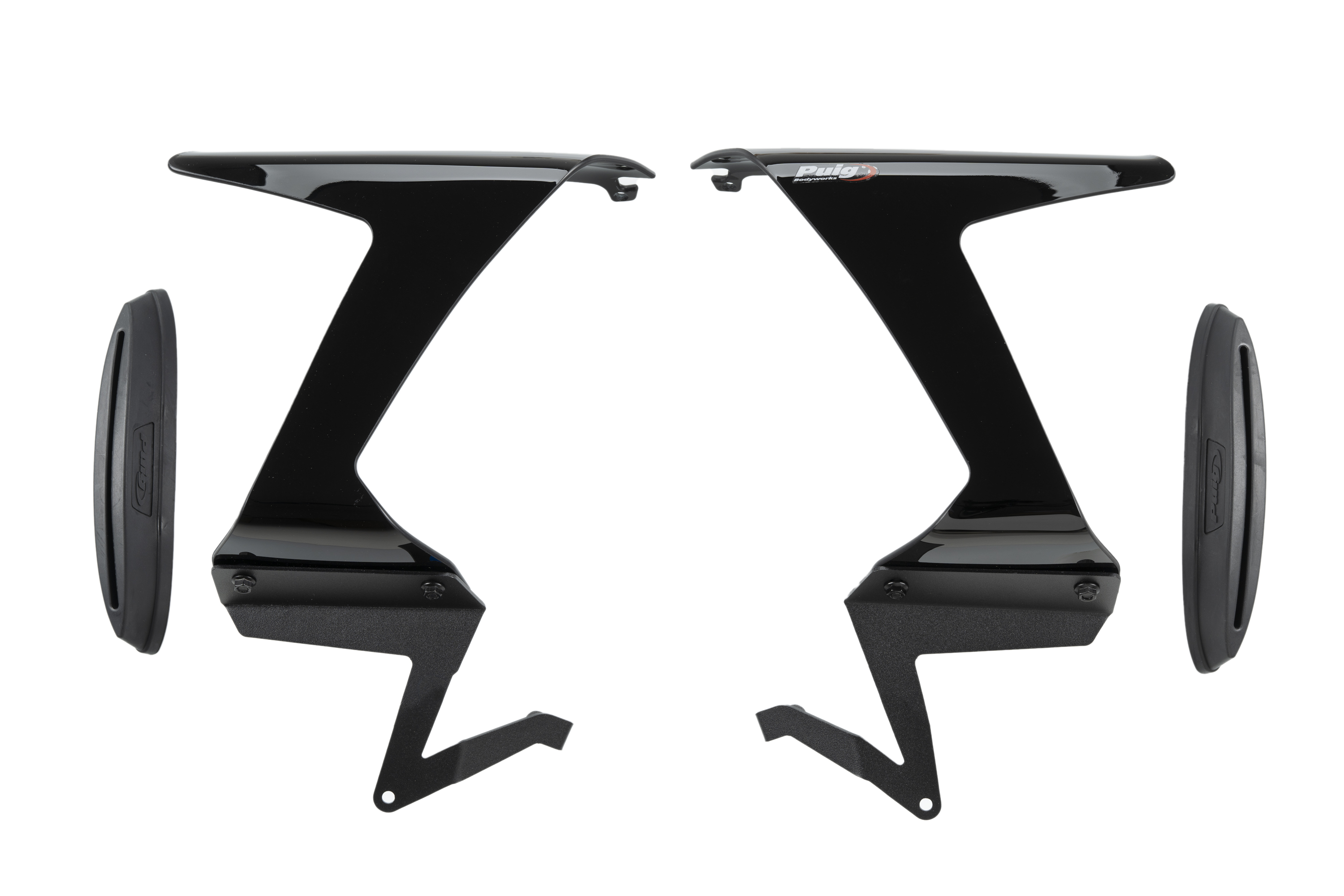 Sono costituiti da due elementi: supporti iniettati in plastica flessibile che si adattano perfettamente alla carenatura della tua moto per mezzo di un adesivo 3M dual lock, forte, resistente e durevole, ma che può essere rimosso e non danneggia né richiede di forare la tua carenatura. E il secondo elemento è uno spoiler di forma chiusa, che è realizzato in materiale acrilico ad alto impatto da 4 mm secondo le norme di sicurezza, con bordi arrotondati con raggio> 2 mm, un materiale di grande rigidità e leggerezza, perfetto per ricevere la pressione aerodinamica e traslare direttamente in carico aerodinamico.